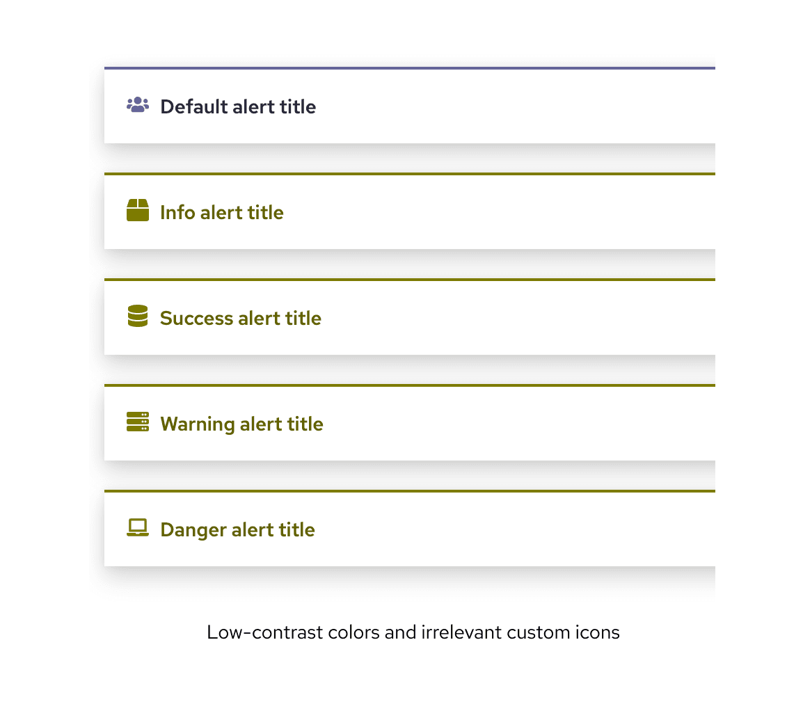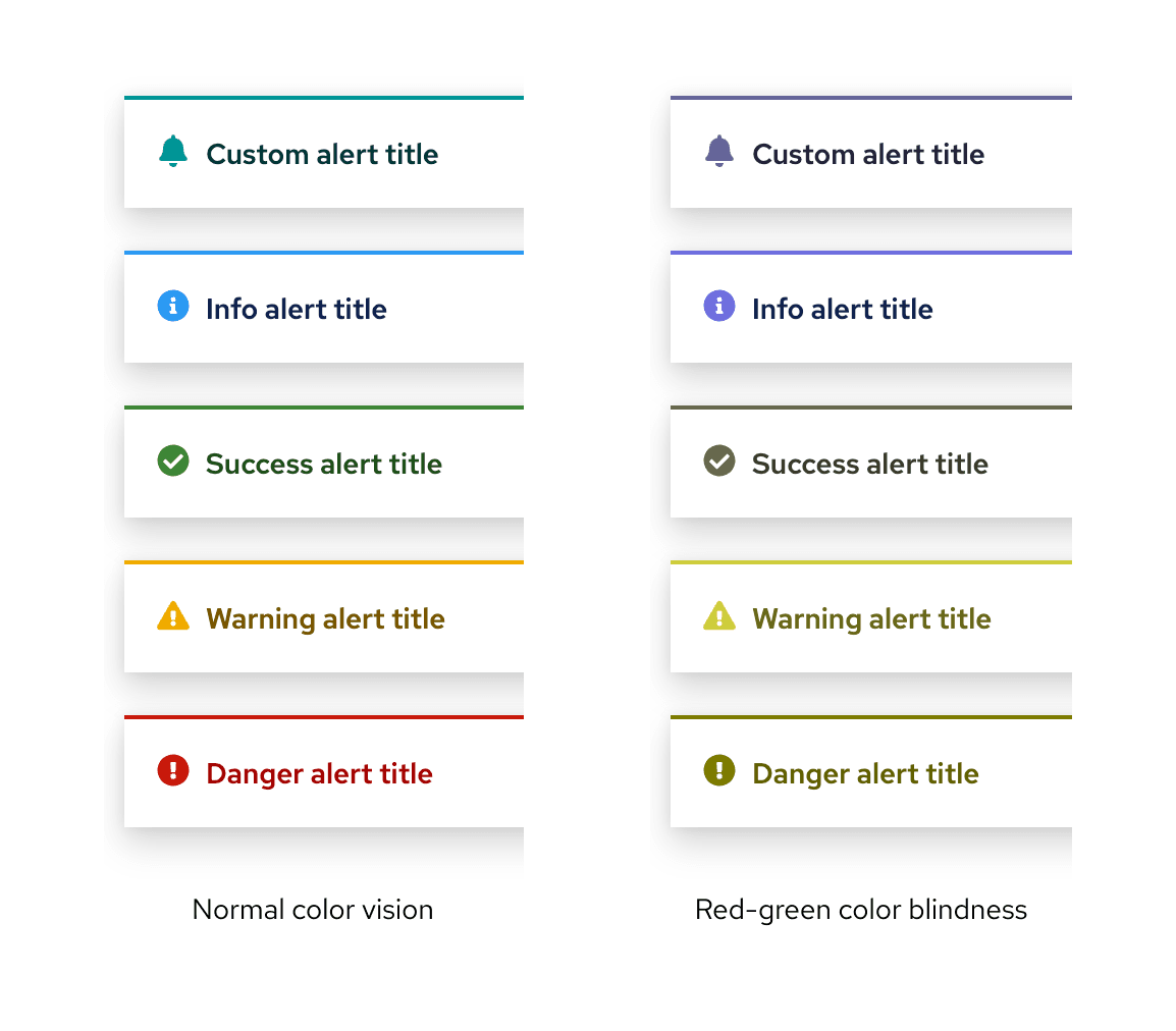 It's important not to solely rely on color for conveying information. Even though PatternFly components pass color contrast tests, they also use icons to further help with identification, which can be especially helpful for users with a form of color blindness.