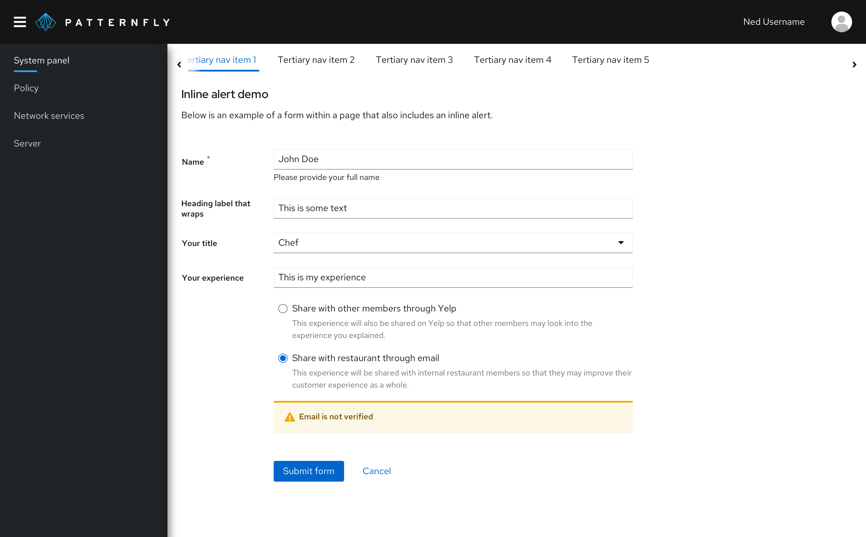 Use bordered inline alerts to return feedback as the result of a user action within a page without blocking the user’s workflow. Common uses for bordered inline alerts include form validation and warning messages.