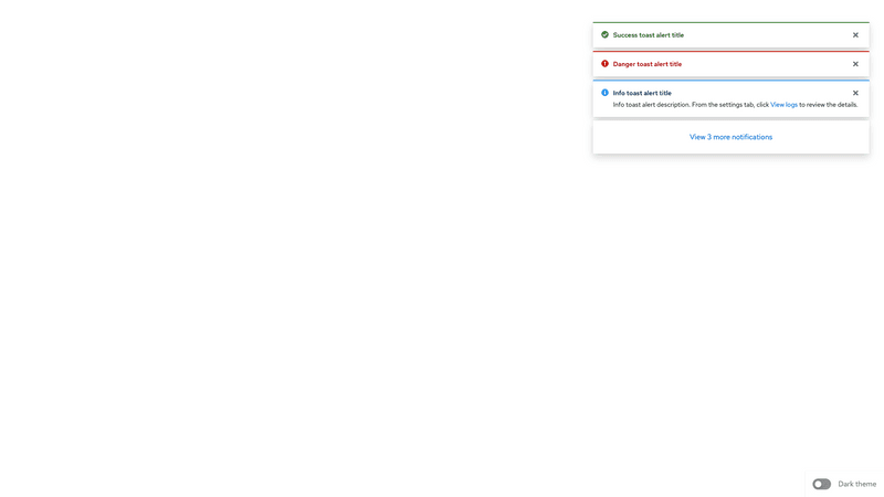 The alert component is used to contain and align consecutive alerts. Alert groups can either be embedded alongside a page's content or in the top-right corner as a toast group using the .pf-m-toast modifier.