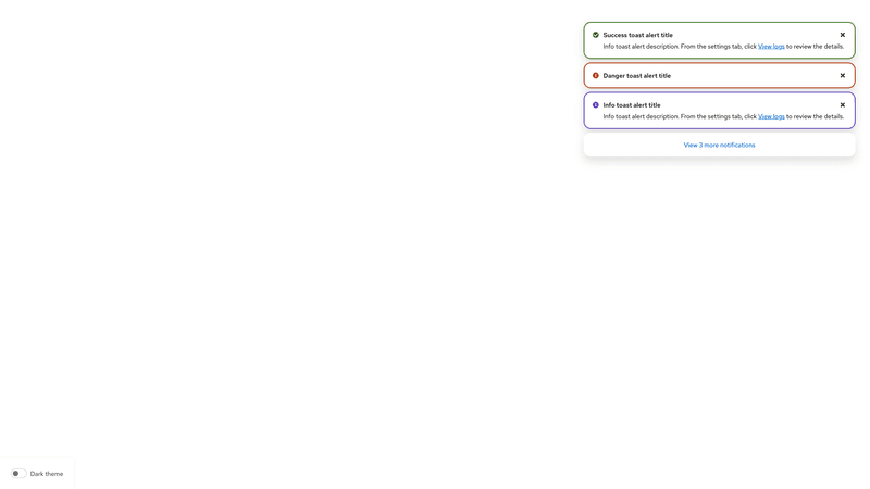 An alert group is required to display toast alerts. An alert group that includes the .pf-m-toast modifier becomes a toast alert group with unique positioning in the top-right corner of the window.