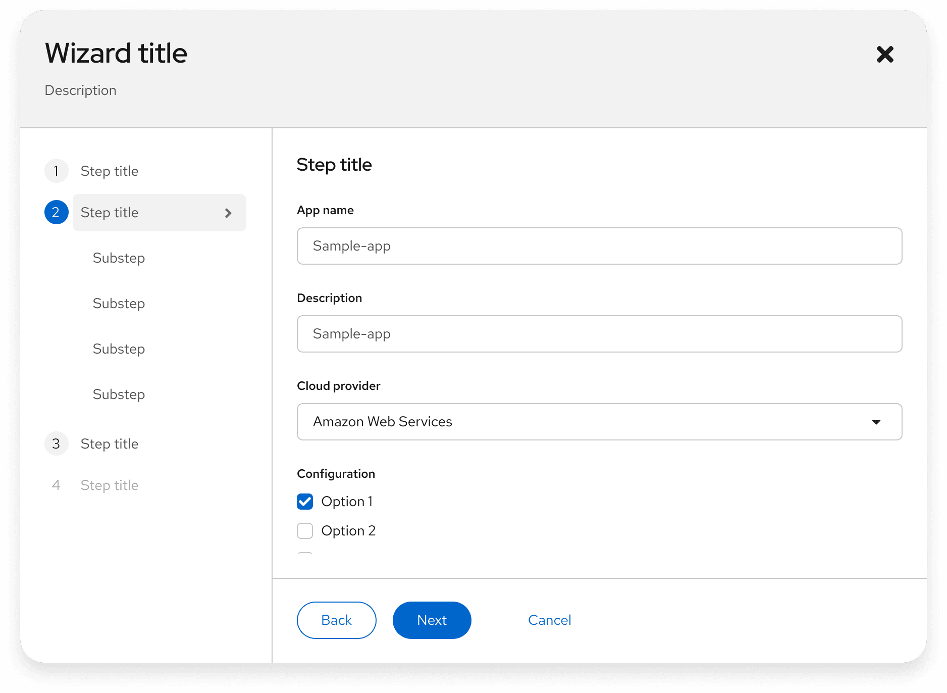 In wizards, the Cancel button is spaced --pf-t--global--spacer--2xl (48px) away from the primary and secondary Next and Back buttons, and --pf-t--global--spacer--lg (24px) away if stacked.