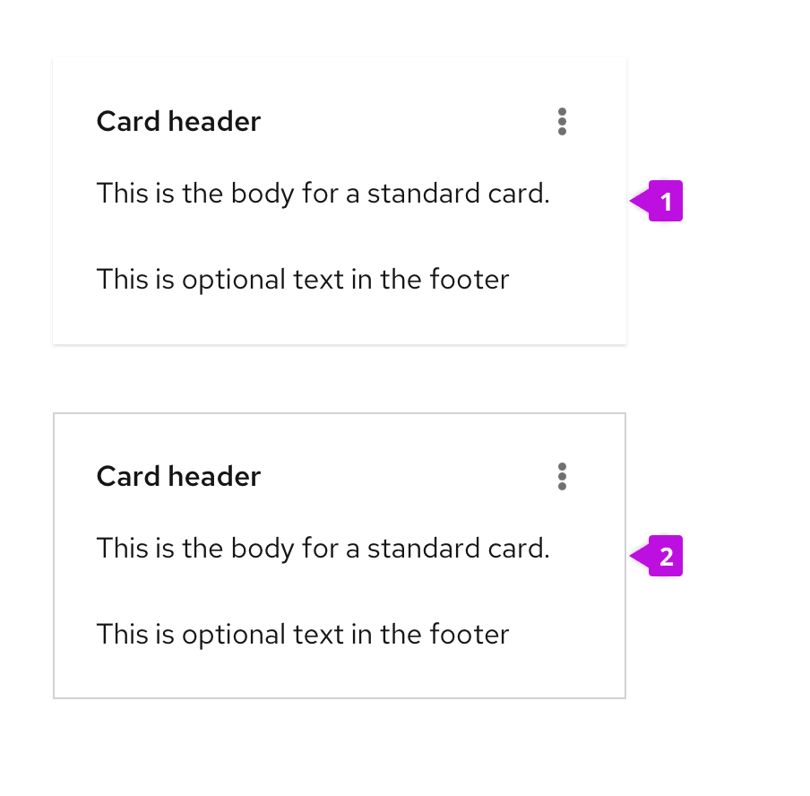 - Default card: Use by default. Default cards have no fill and are instead distinguished by a thin border.