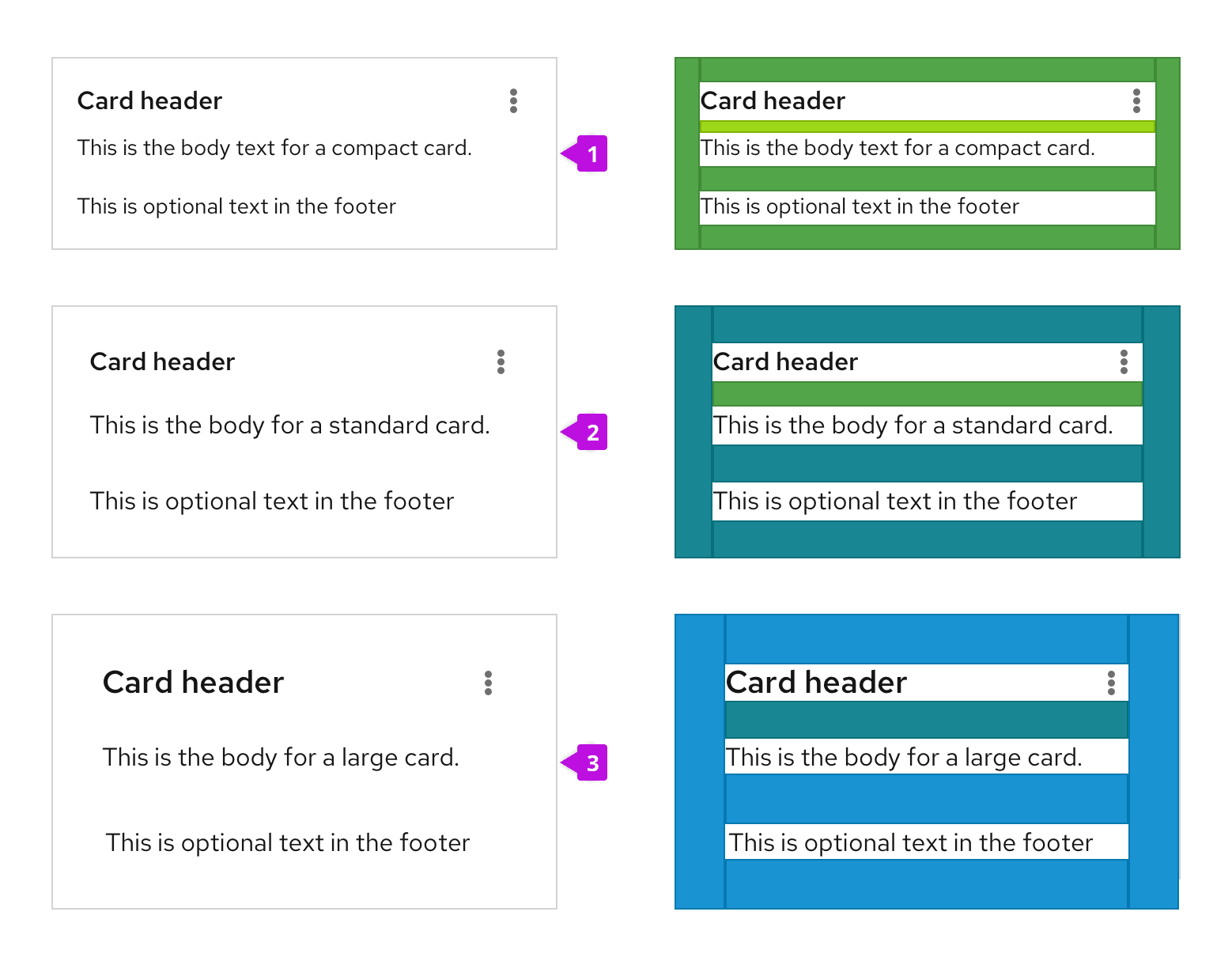 - Standard: Standard cards use 24px spacing with a 16px spacer between the header and body and 24px between the body and footer.
