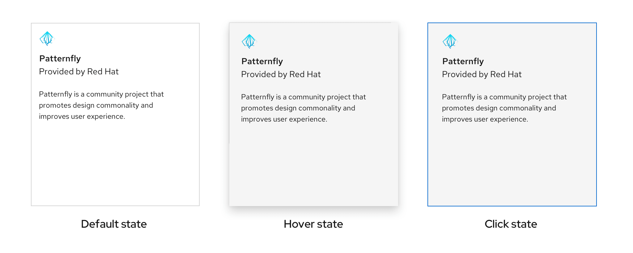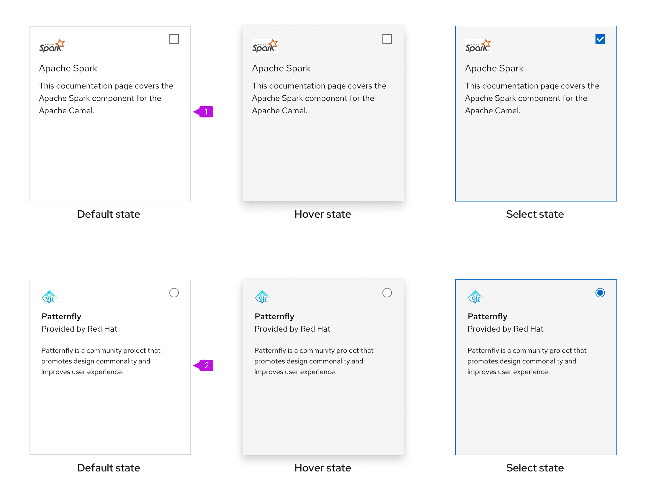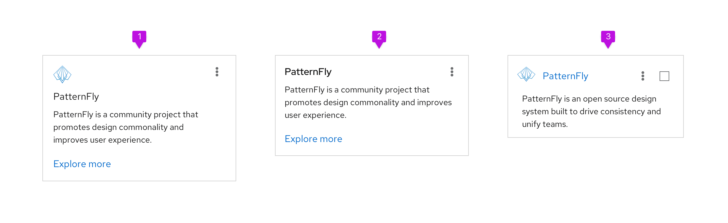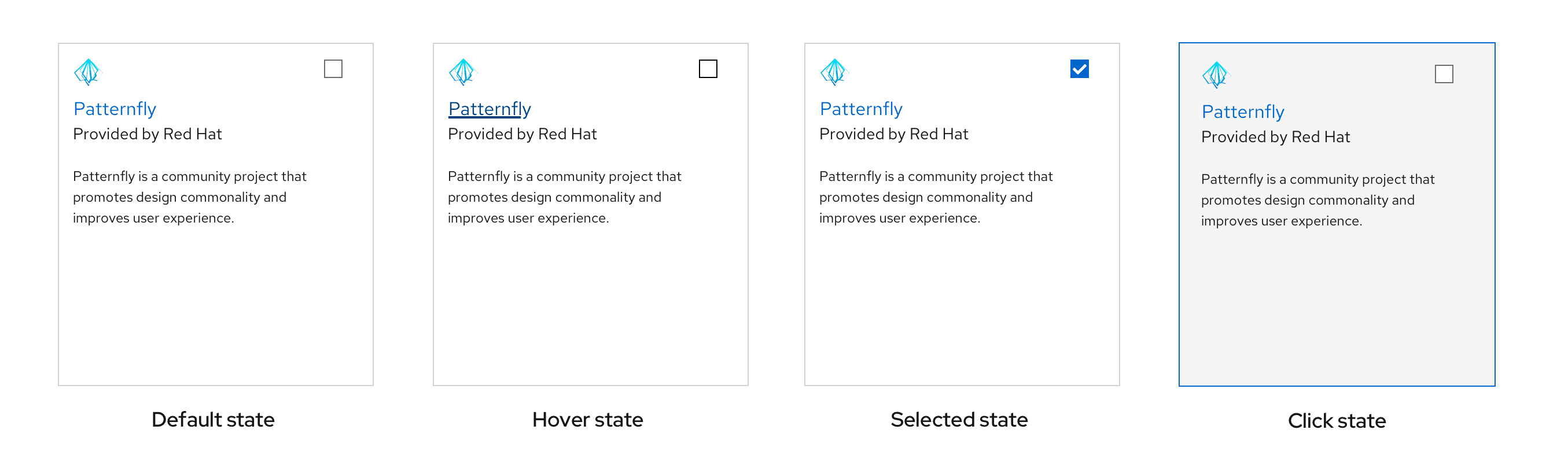 Selectable cards have a checkbox or radio button to indicate that a card is selectable. To select a card, users can click anywhere on the card. PatternFly supports two types of selectable cards: