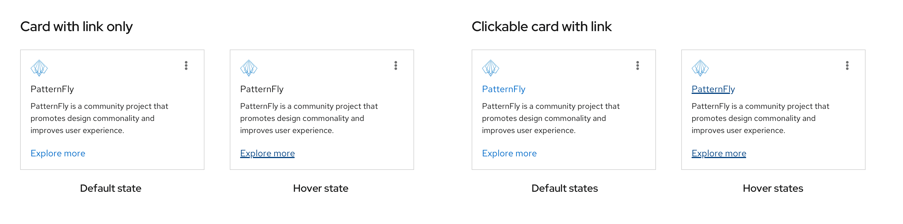 For clickable cards, a user must click on the card header linked in blue to trigger an action.