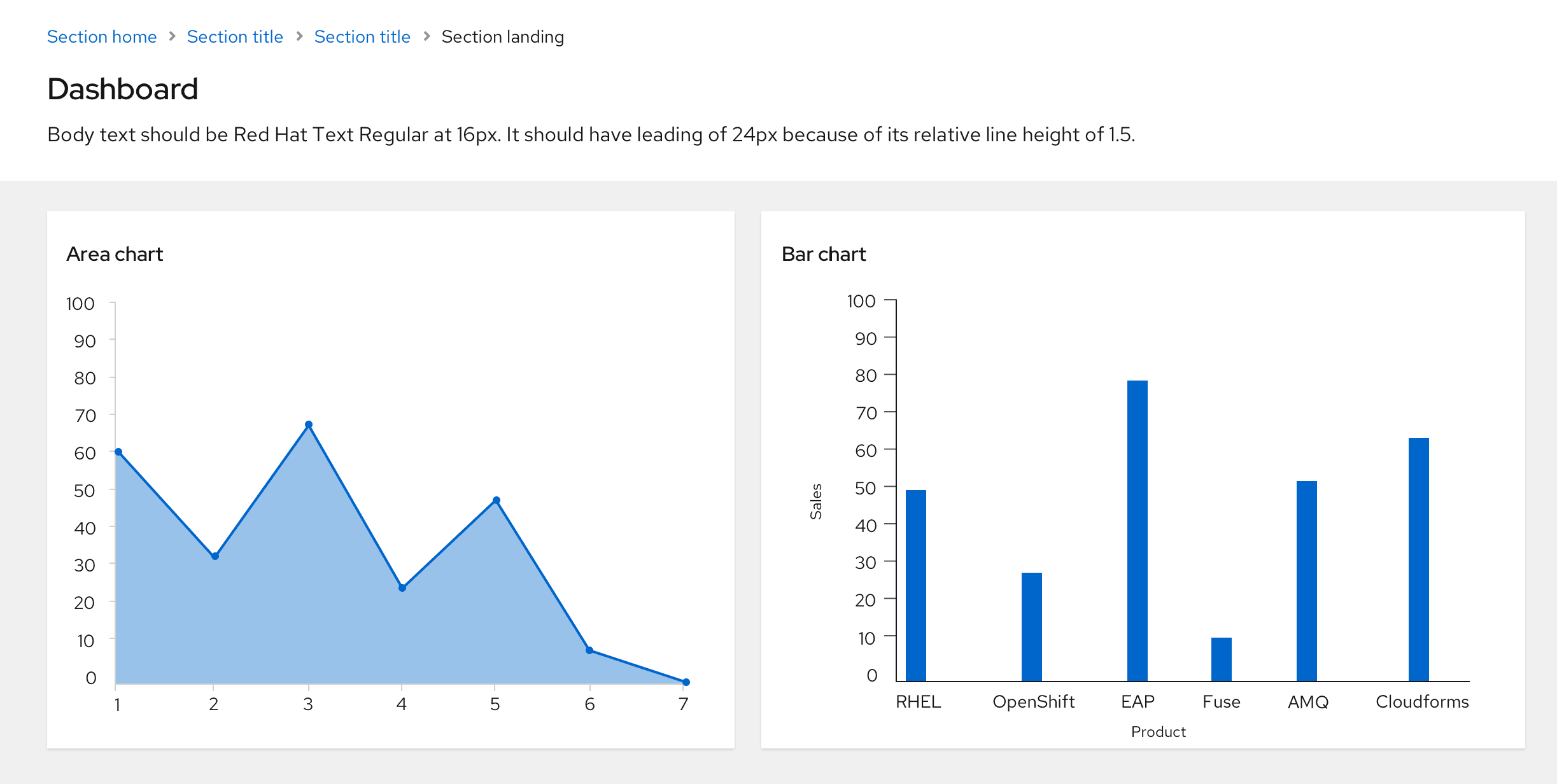 Use cards in a dashboard view to visualize information. Each card should display a different and specific piece of information, such as a bar chart, area chart, or other data type.