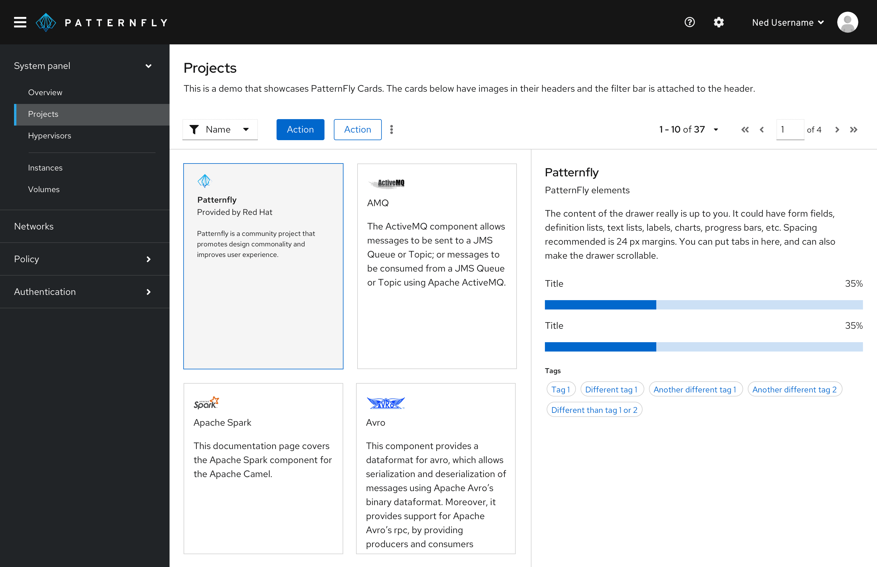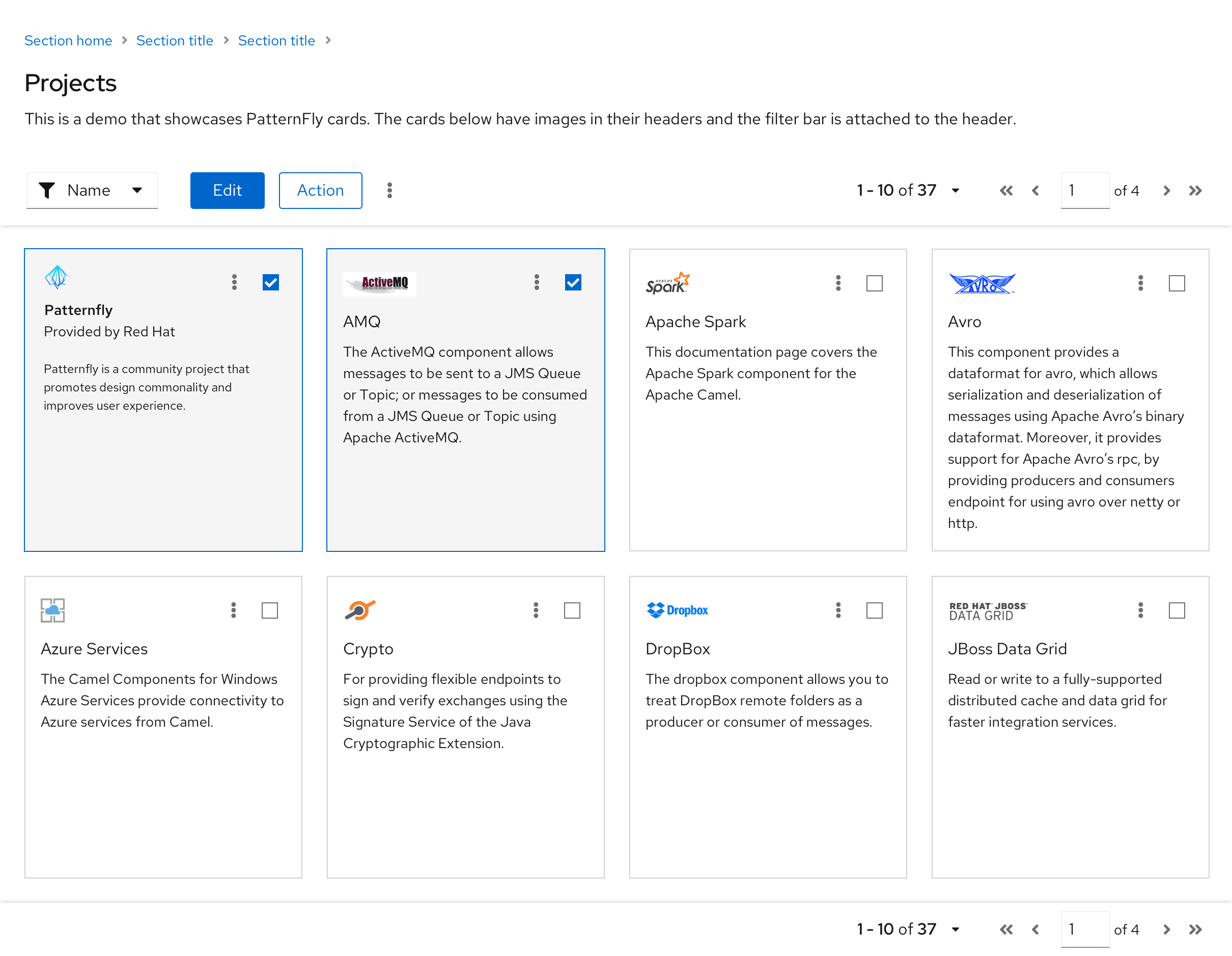 - In the third version, the card header contains an image as well as text to define the card title. This makes the footprint of the card smaller. The title is a link, allowing users to drill into the details of the card. The linked title should be reserved for when using a card that can be both clickable and selectable, where clicking the title would open the primary-detail drawer or navigate the user to a new page and selecting the card would be done by clicking on the checkbox.