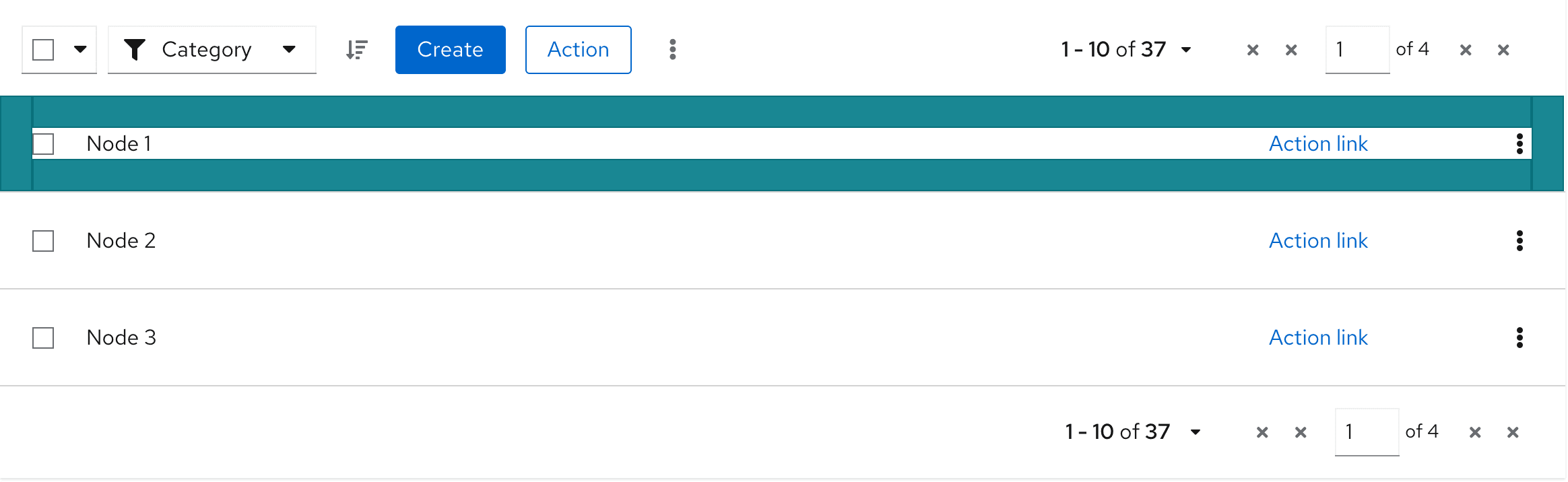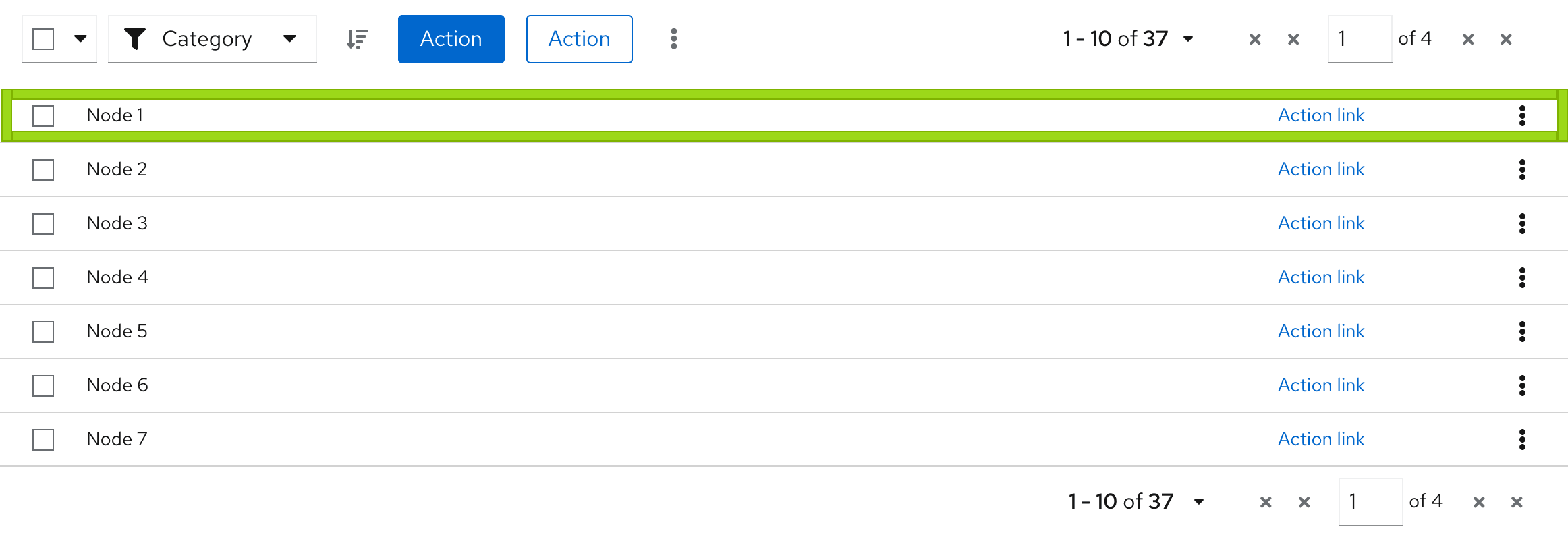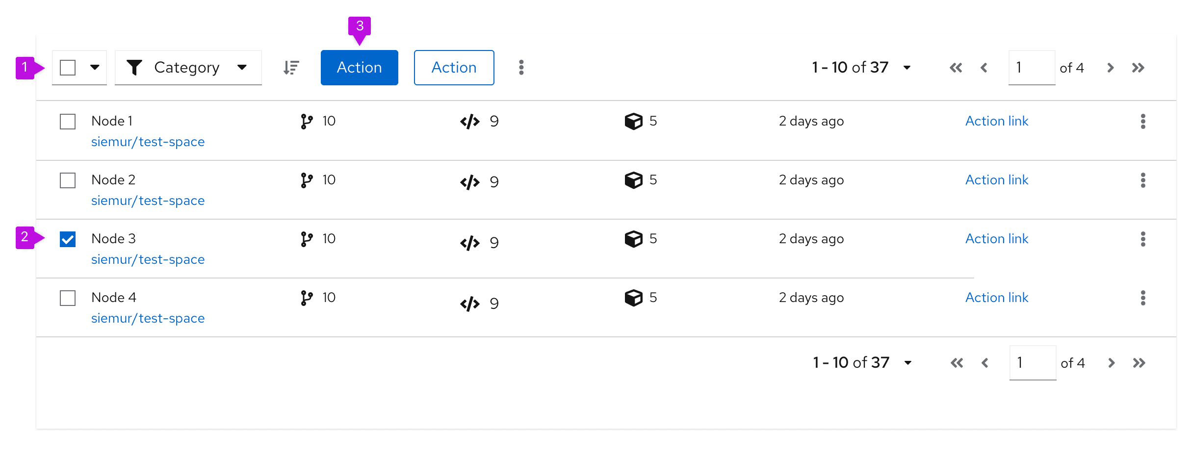 - Global actions: Actions that can be applied to all selected items. If actions in the data list are restricted to a single row or object, keep the actions at the individual row level, instead of in the toolbar.