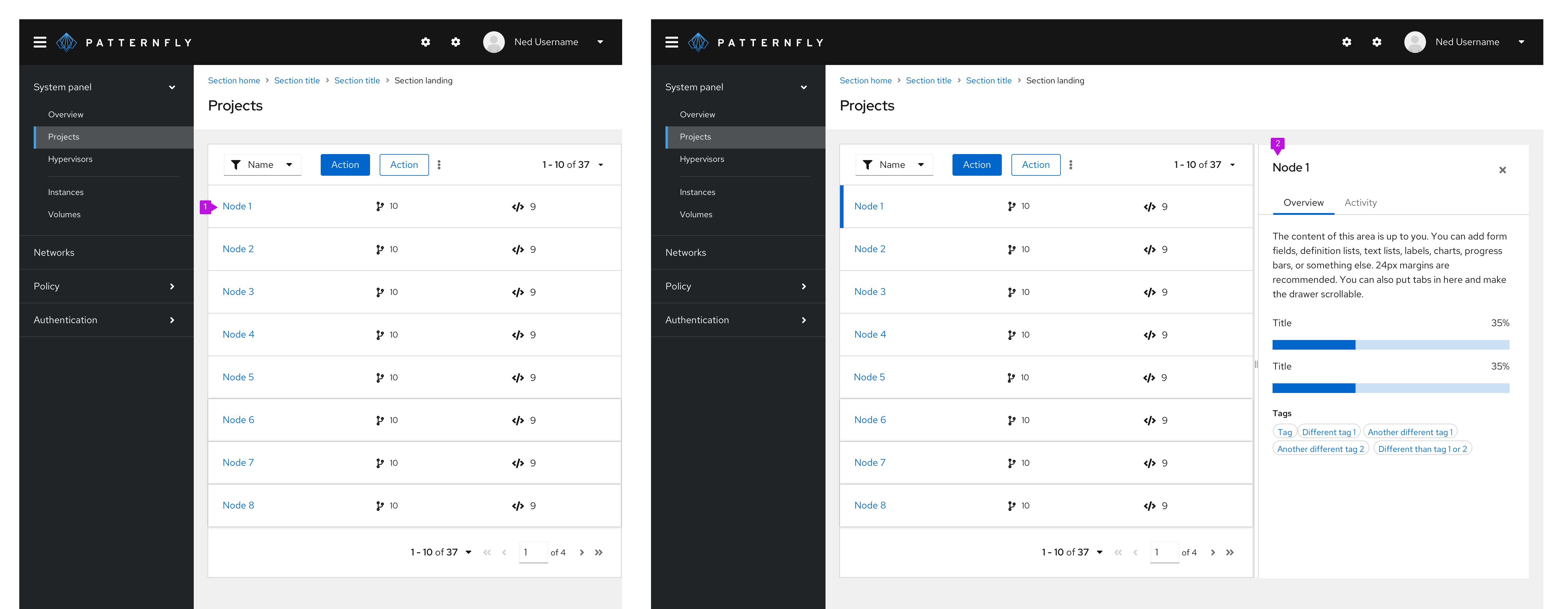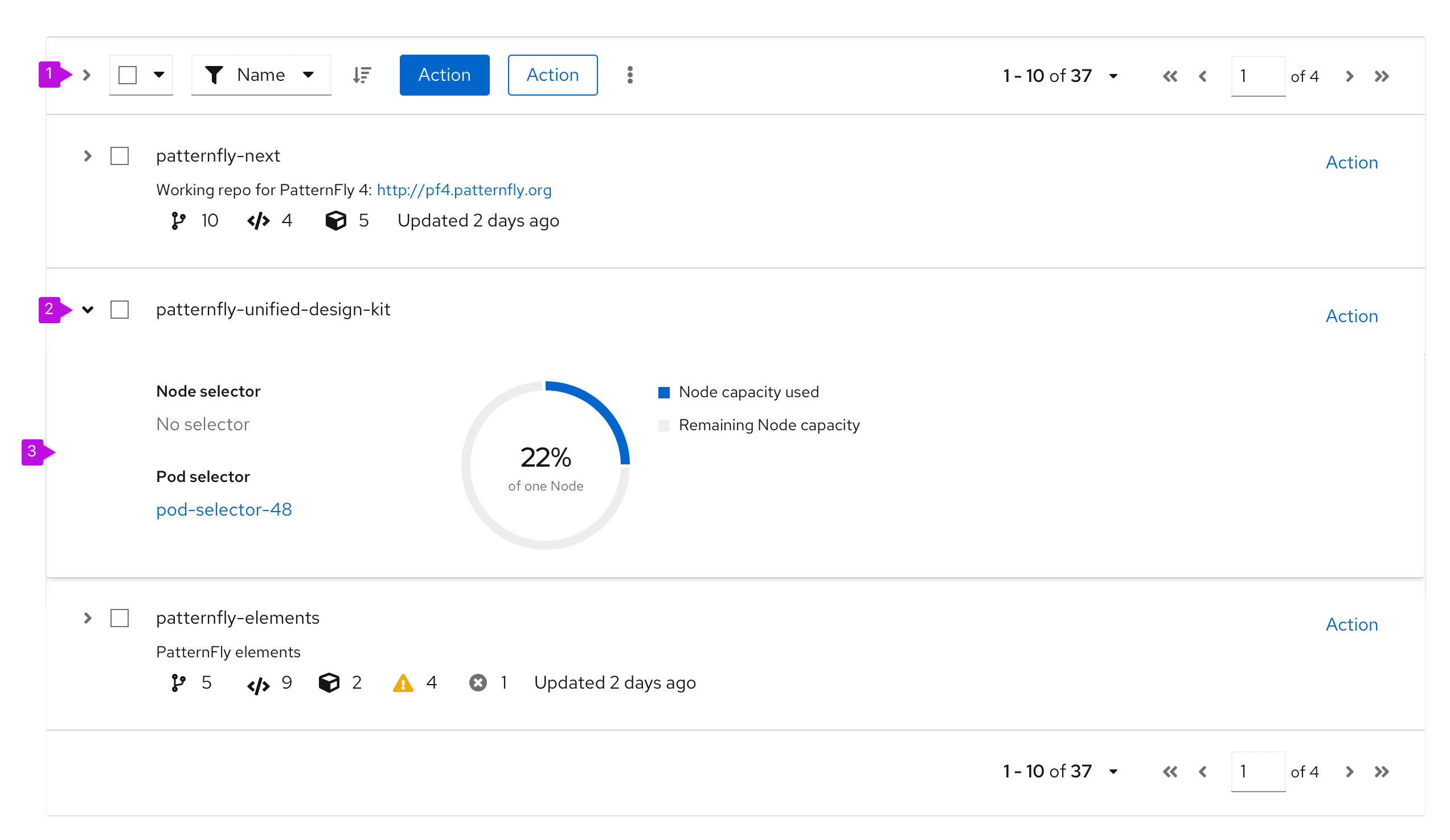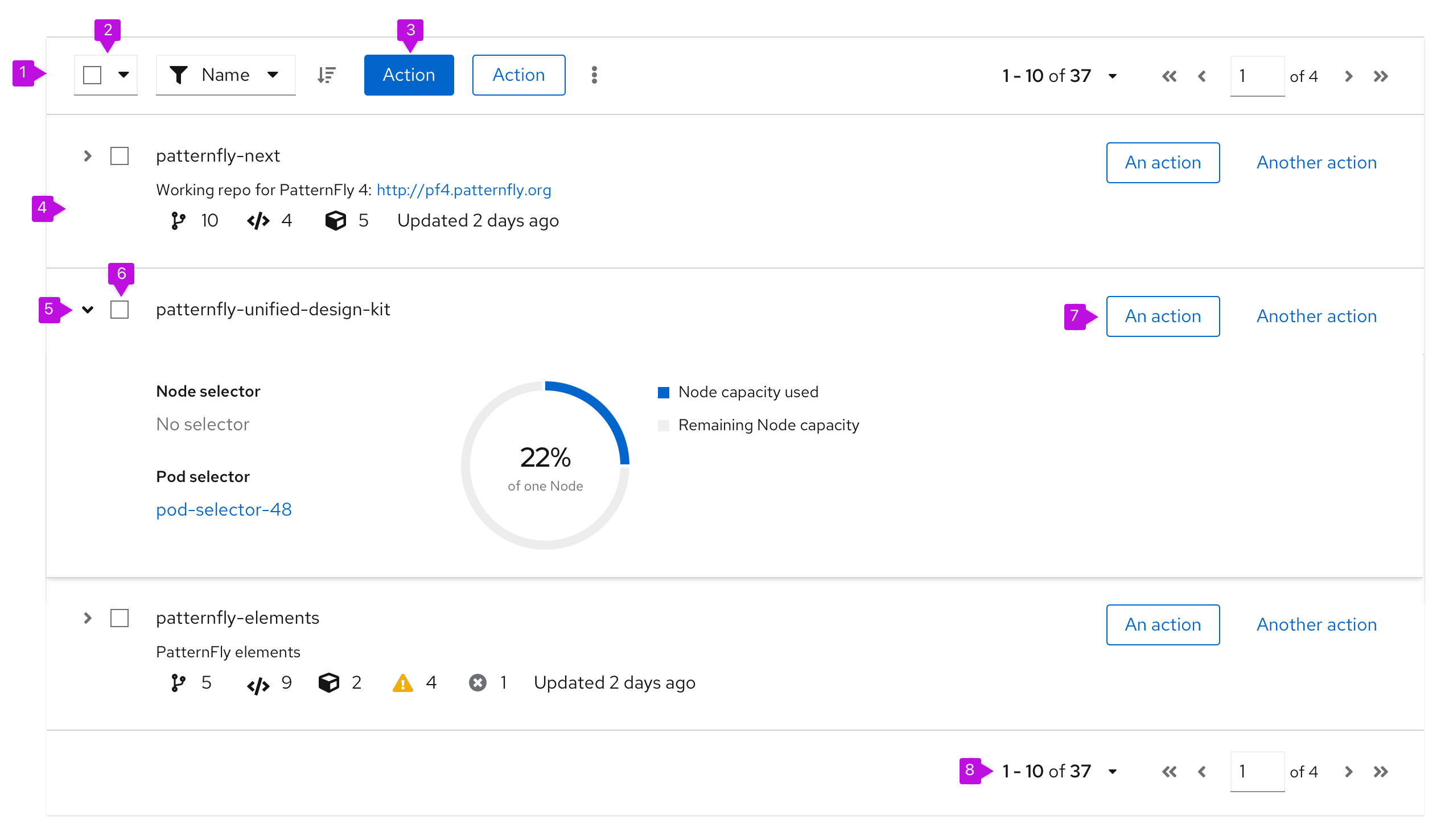 PatternFly offers 2 components for displaying large data sets: data lists and tables. While they satisfy similar use cases, choosing the correct component to use in your design will be dependent on the type of data you need to display.