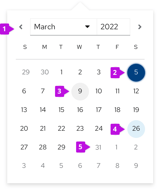 - Previous/future date: Utilizes subtle text colors for days outside of the selected month.