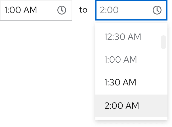 Typically, time picker menus list selectable times in 30-minute increments. However, users always have the option to input any desired times that don't fall on the suggested time increments. For example, a user could type in 12:38 PM despite the list of options only showing 12:30 PM and 1:00 PM options.