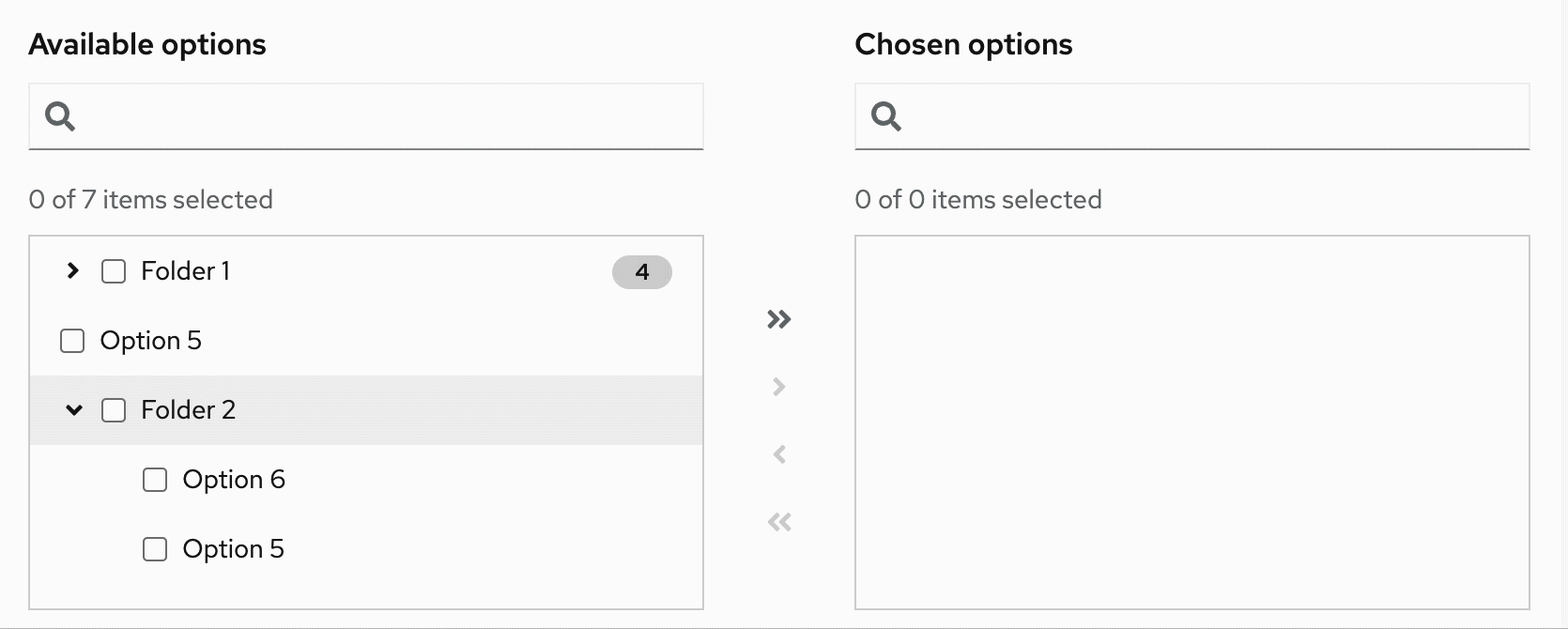 - Folder: Group of items that can be moved between lists. When a folder has a mix of selected and unselected items, the checkbox should have a mixed state. When all items in a folder are selected, the folder checkbox should have a selected state.