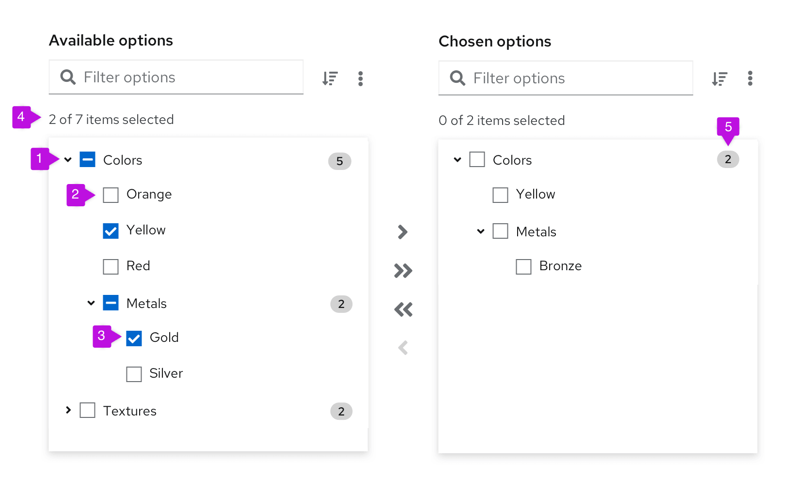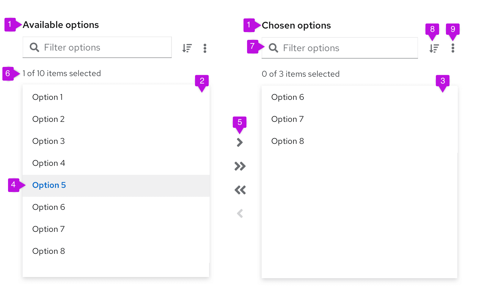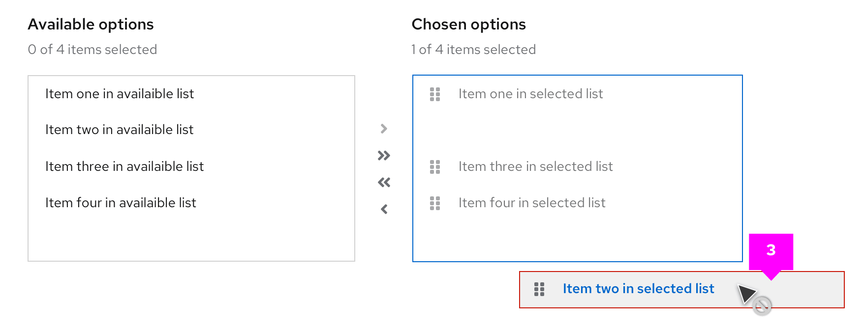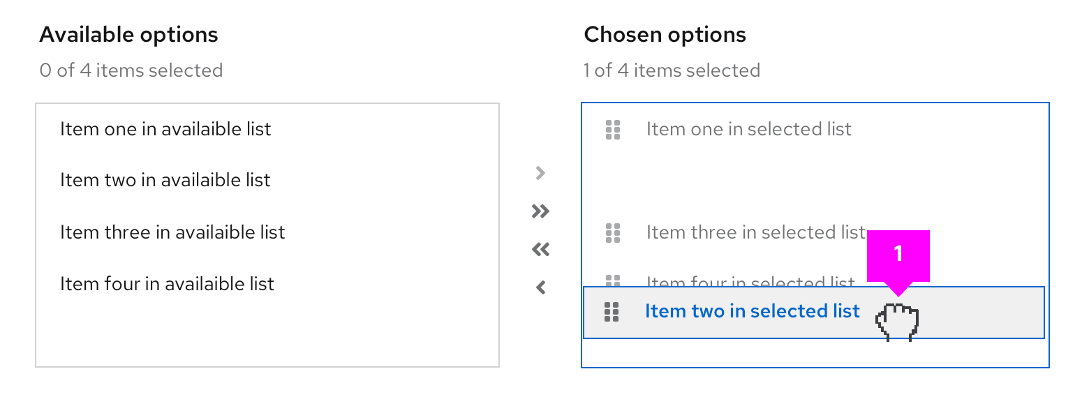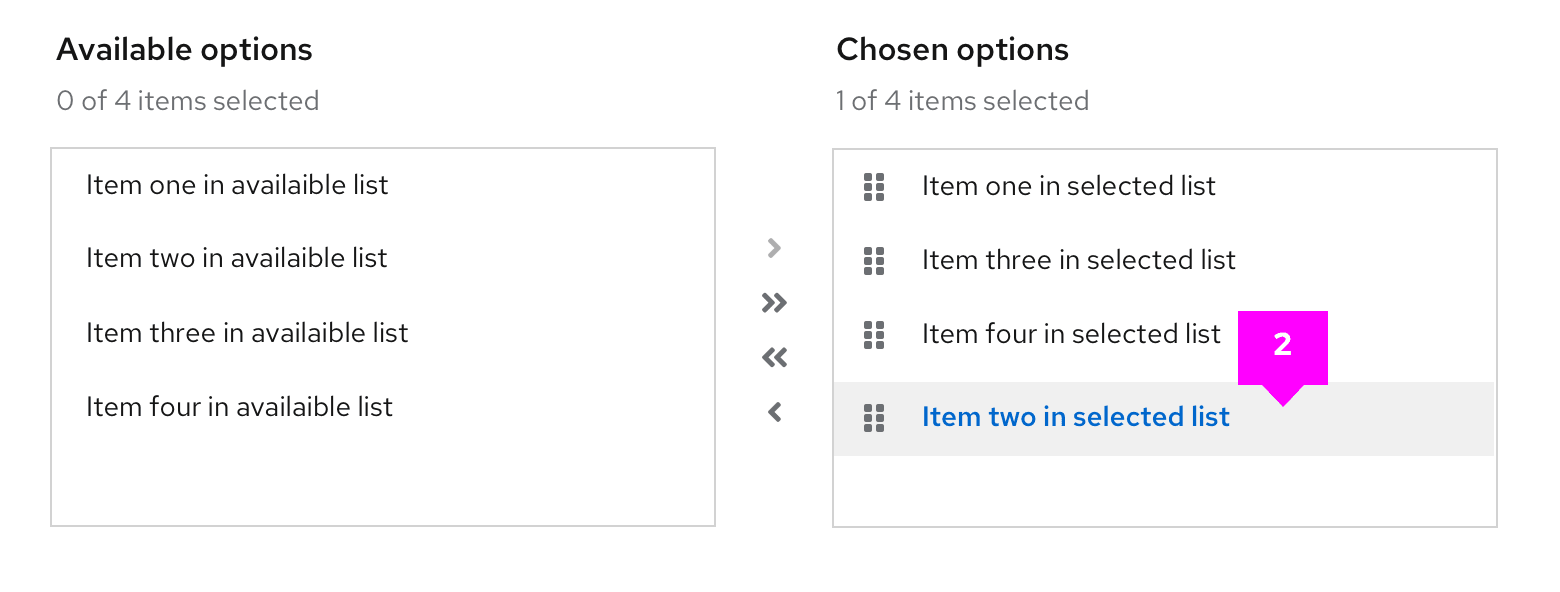 - List labels: Distinguish between the list of available options and the list of chosen options. You can change these for your use case, but they should remain clear and concise.