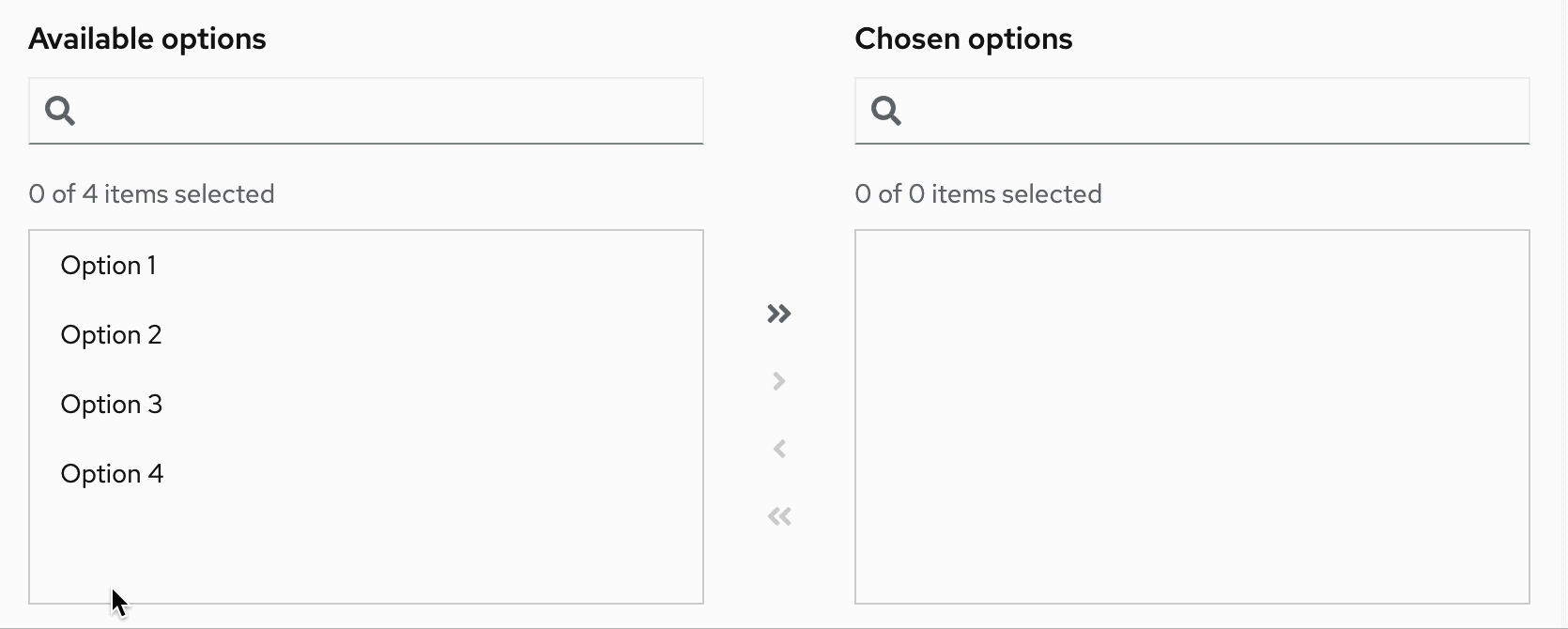 Users can select 1 or more items from the available options, using the arrows to move these items to the chosen options list. Users can filter down the items by using the search input field.