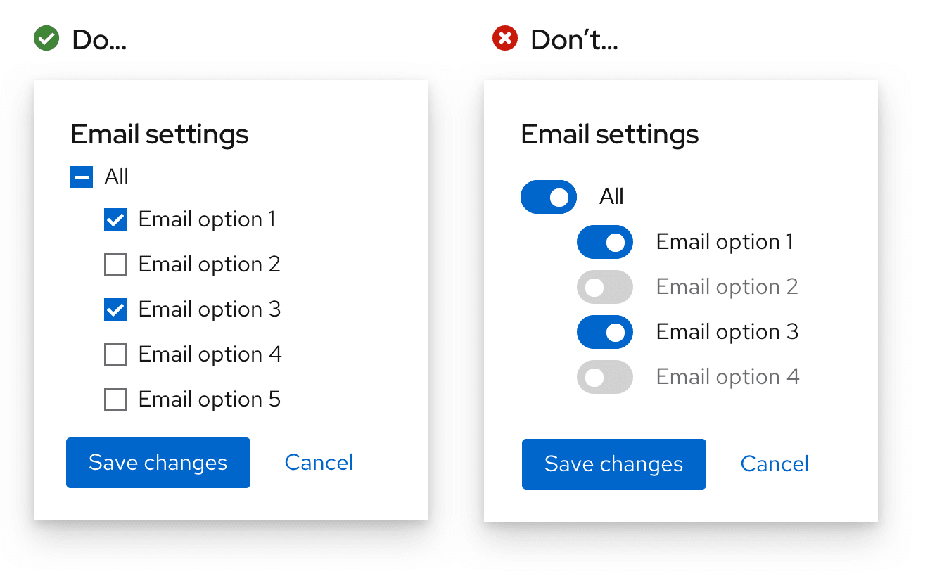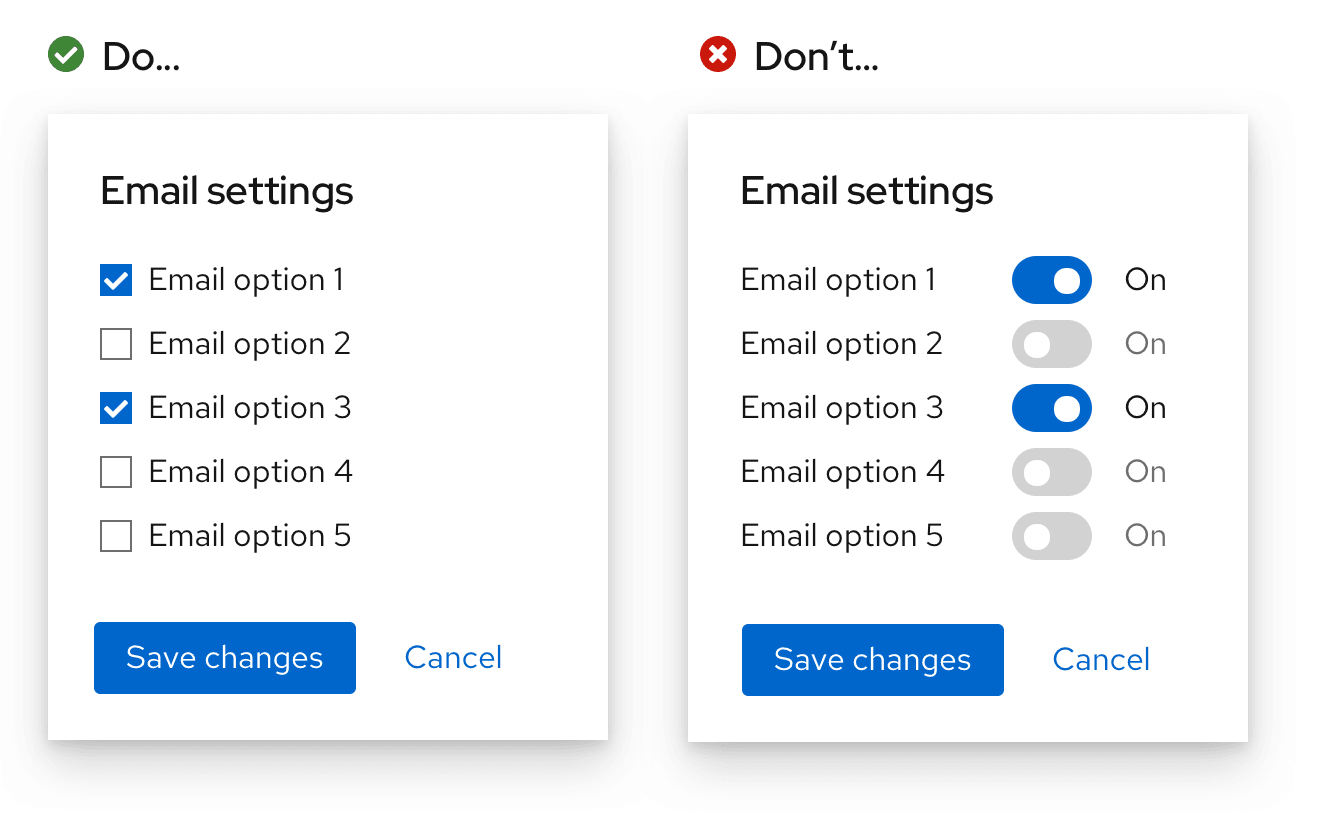 - Use checkboxes if you’re presenting 5 or fewer options to the user. If you’re presenting more than 5 options, use a select list instead.