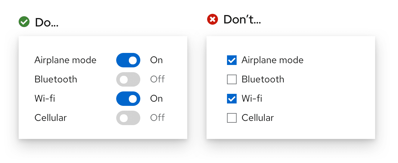 The main difference between a switch and a checkbox is that a switch changes an option and saves it simultaneously, while checkboxes require a separate action such as pressing a “Submit” or “Save” button to save the selection.
