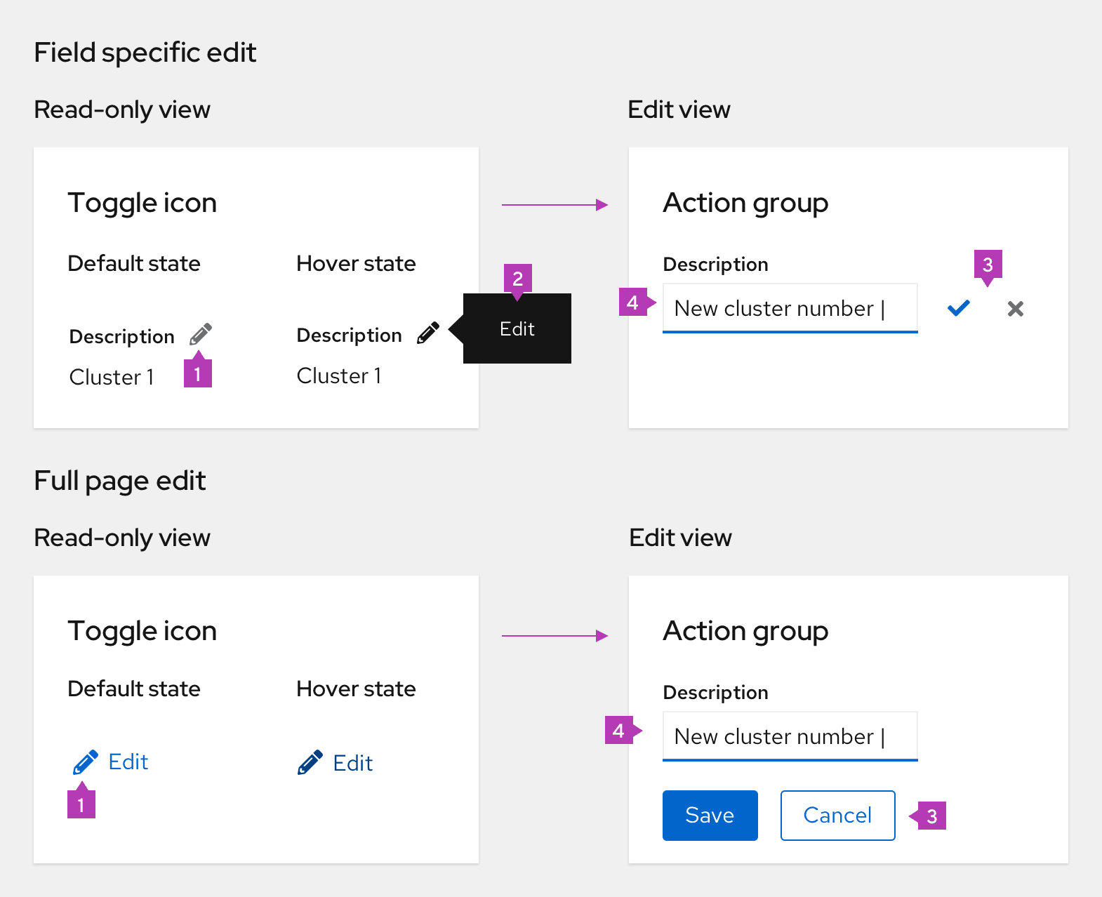 - Users can save or cancel changes using the "Save" or "Cancel" button. Both actions return a page or description list to the read-only mode.
