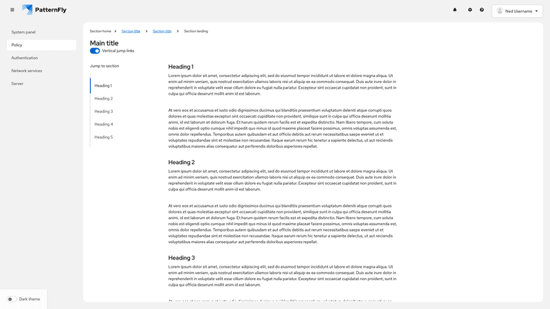 This demo expands on the previous to show the JumpLinks in a vertical layout with subsections. It scrolls the Page's mainContainerId with an offset calculated based on the height of the masthead and the nav list when it appears above the content. The headings are given a tab index to allow the jump links to focus on them.