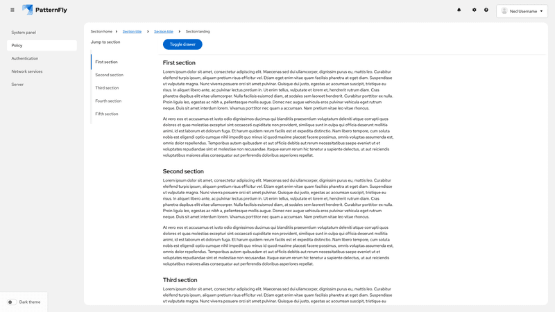 This demo uses a scrollableRef prop on the JumpLinks component, which is a React ref to the DrawerContent component.