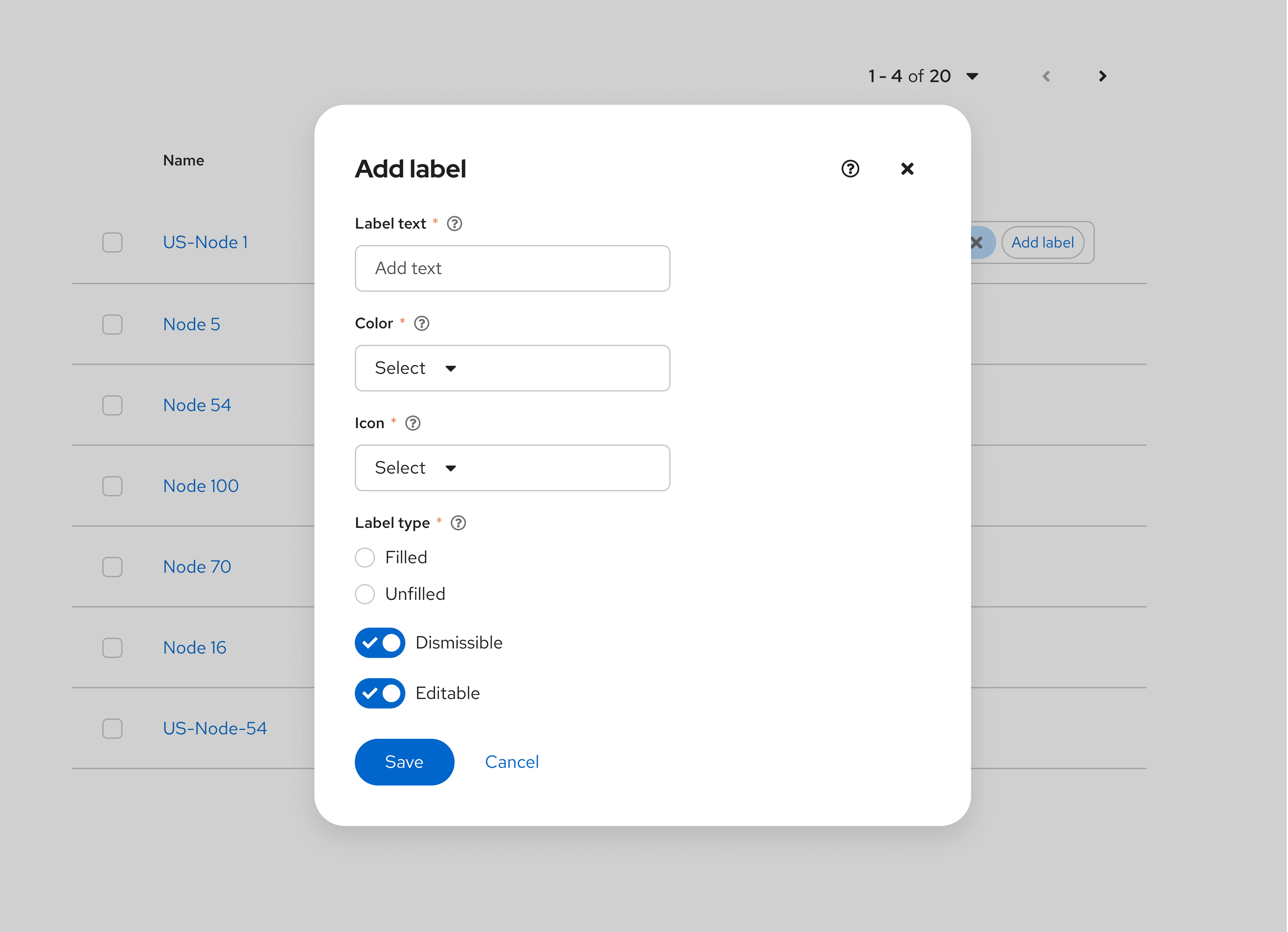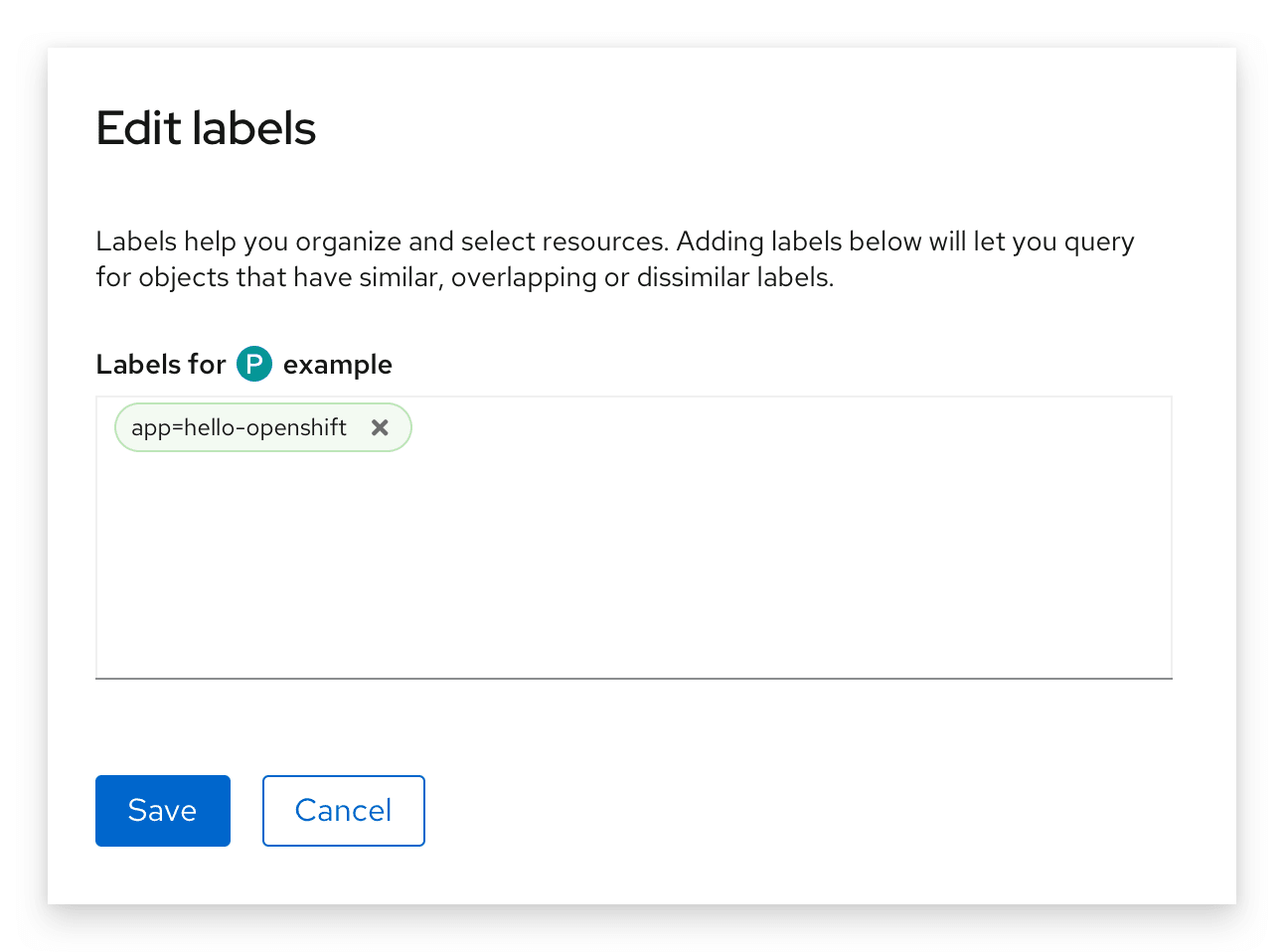 Use editable labels when you want to allow users to organize and select resources manually. Adding editable labels enables the user to query for objects that have similar, dissimilar, or overlapping labels.