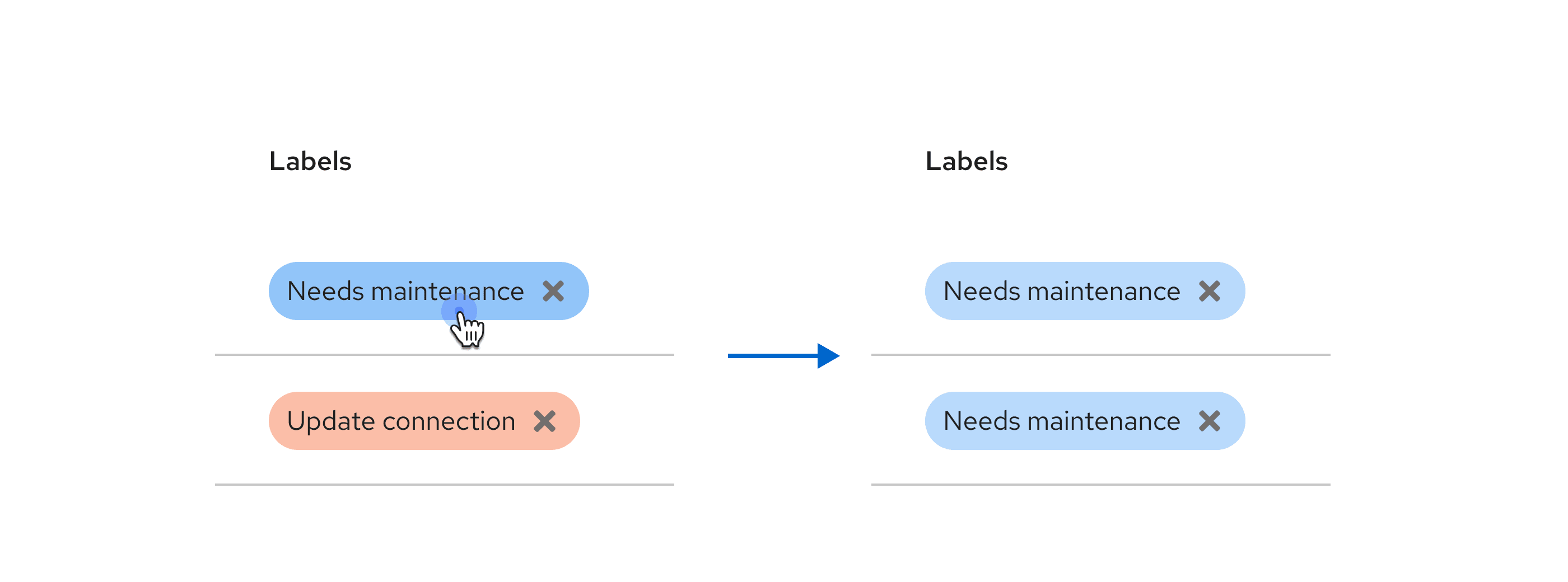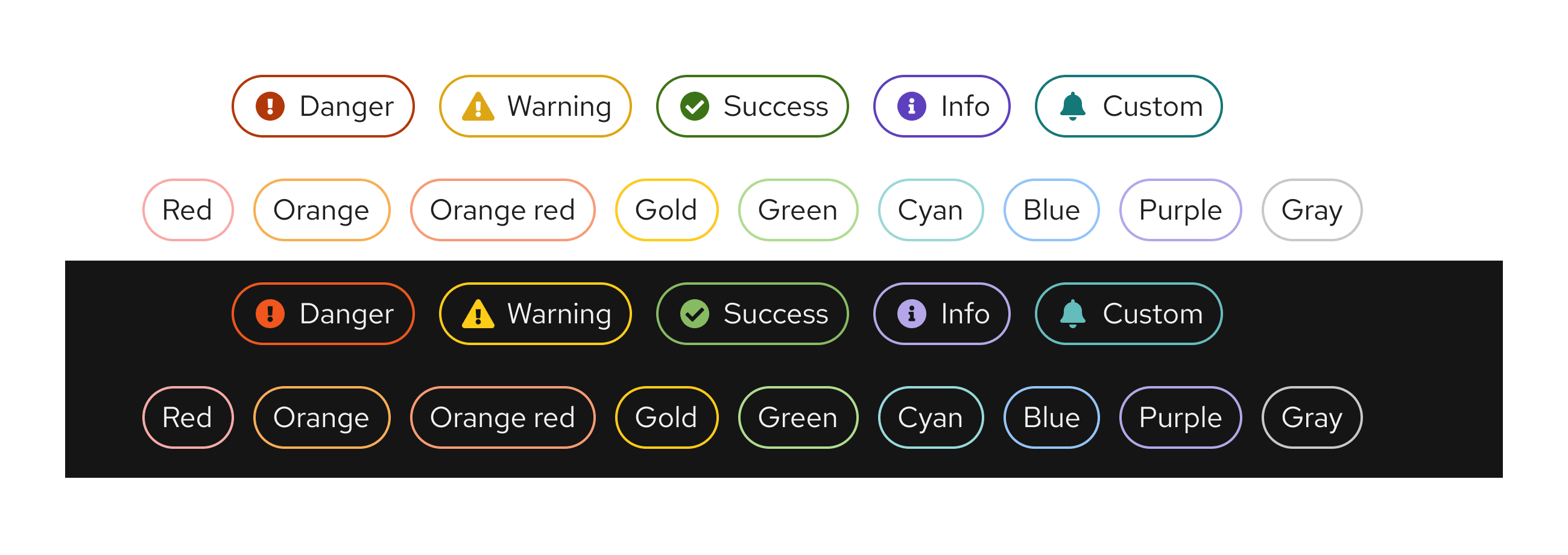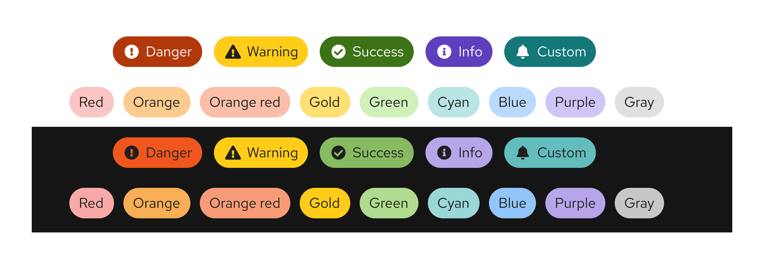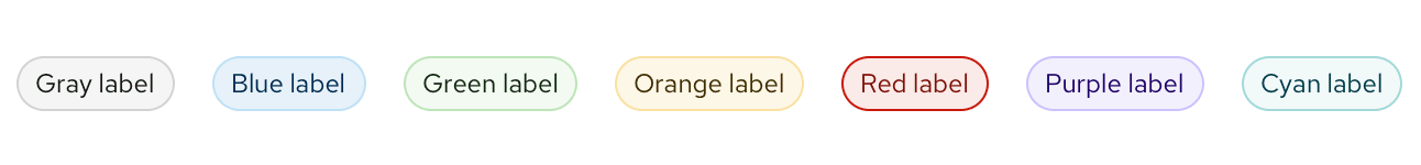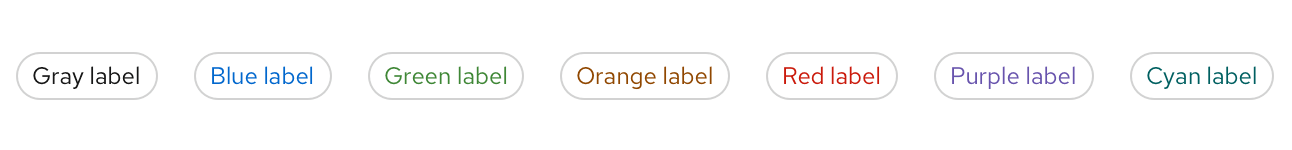 While you may use other colors for your labels, we recommend using the ones provided as they have been carefully selected to be accessible with the PatternFly library. If you choose to use other colors, be mindful of picking accessible text color and icon color to go with the label background.