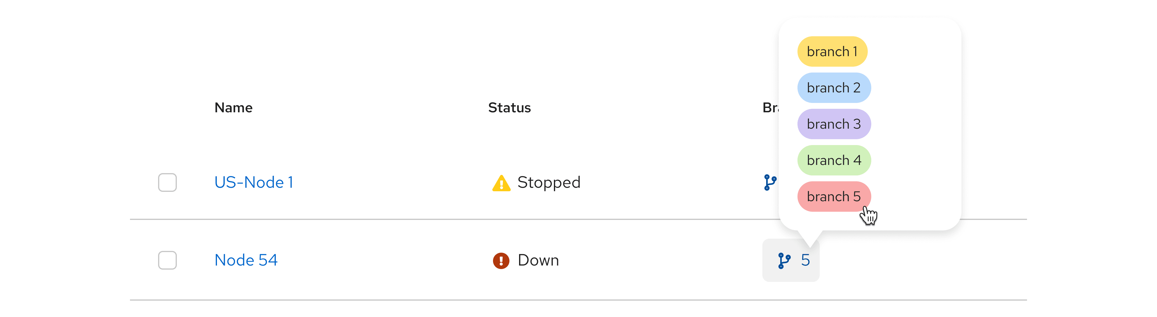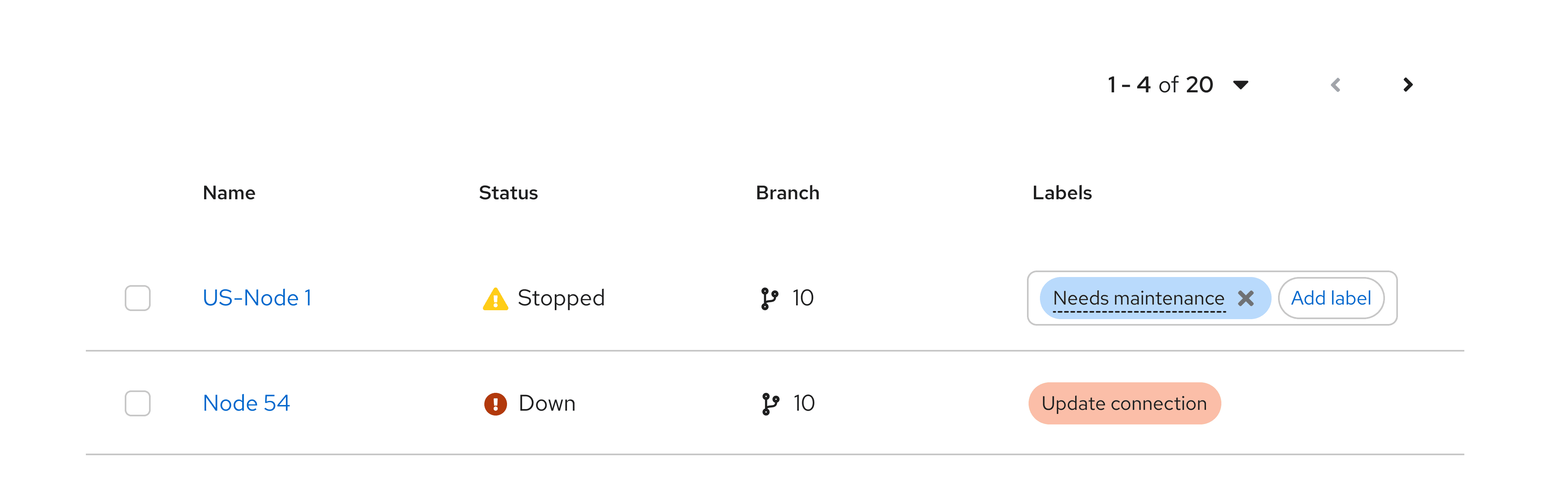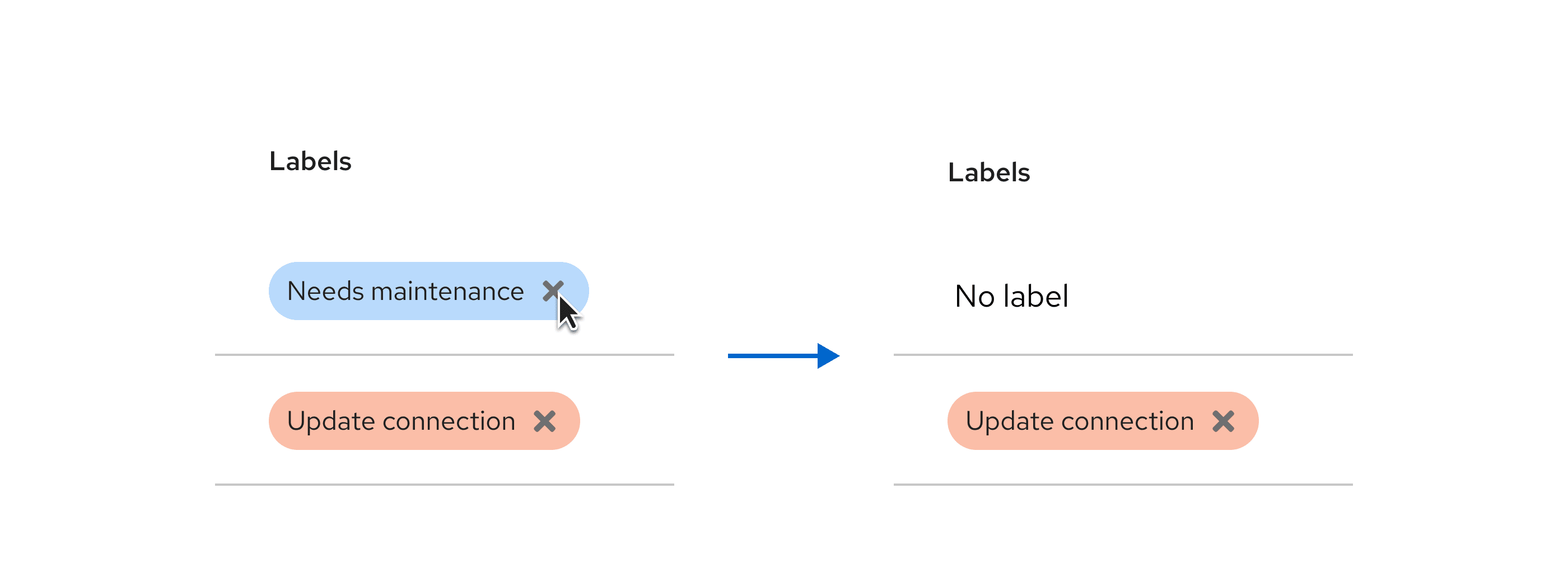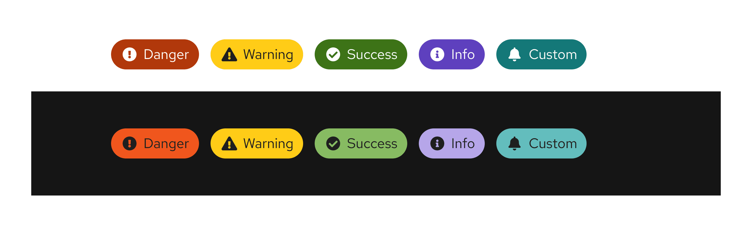While you may use other colors for your labels, we recommend using the ones provided as they have been carefully selected to be accessible with the PatternFly library. If you choose to use other colors, be mindful of picking accessible text color and icon color to go with the label background.
