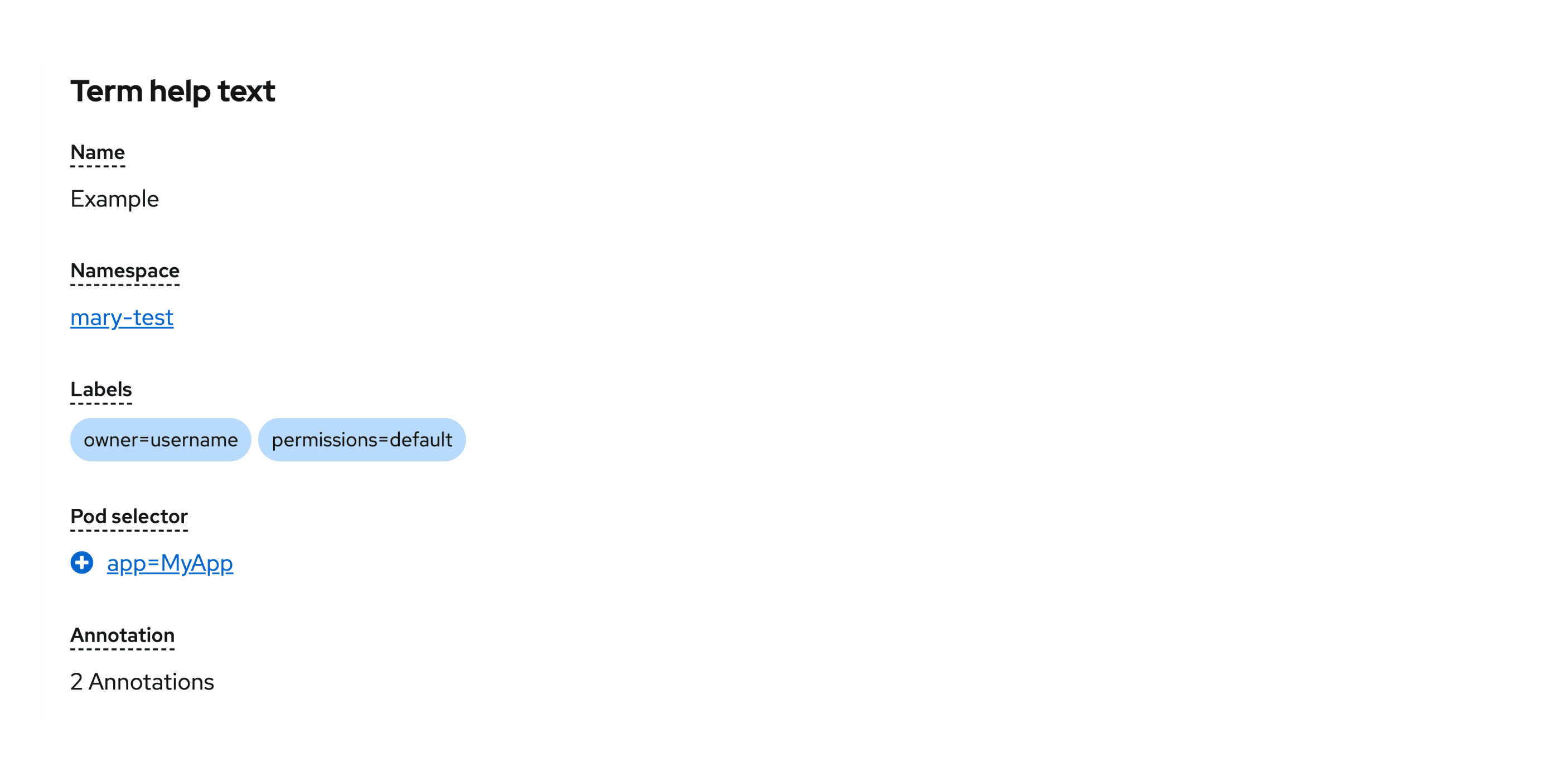 Use a clickable label for labels that trigger actions or link to new pages. Clickable labels include a hover state as shown in the following image.