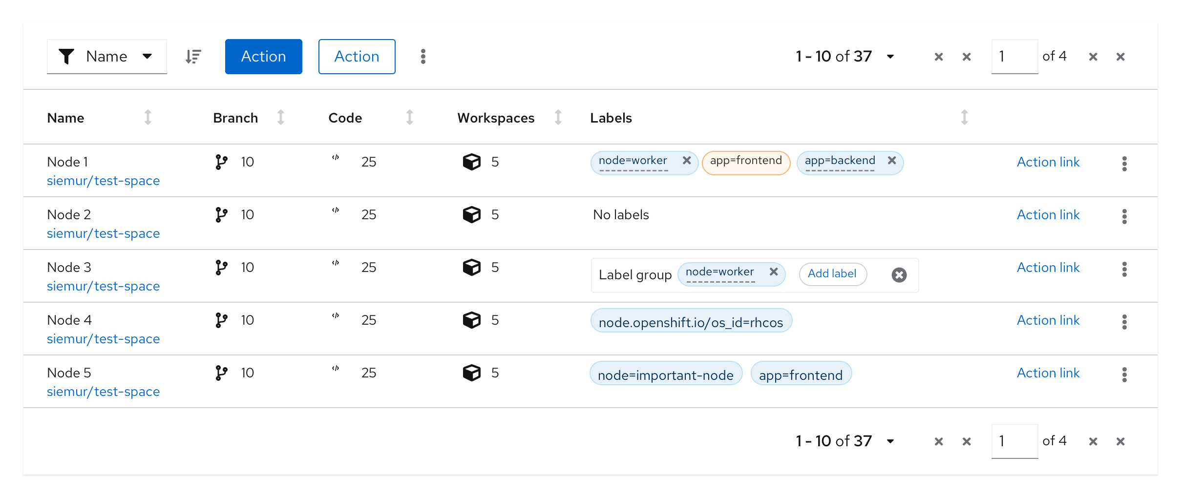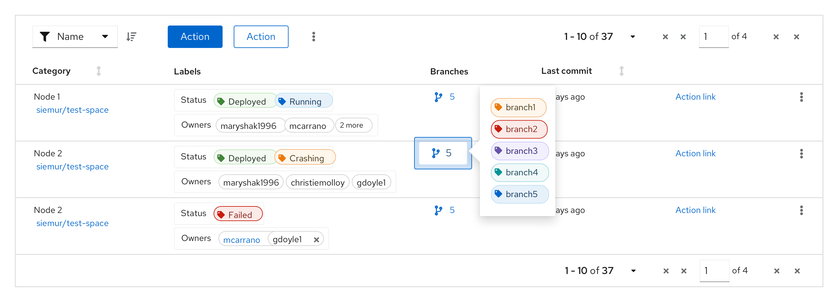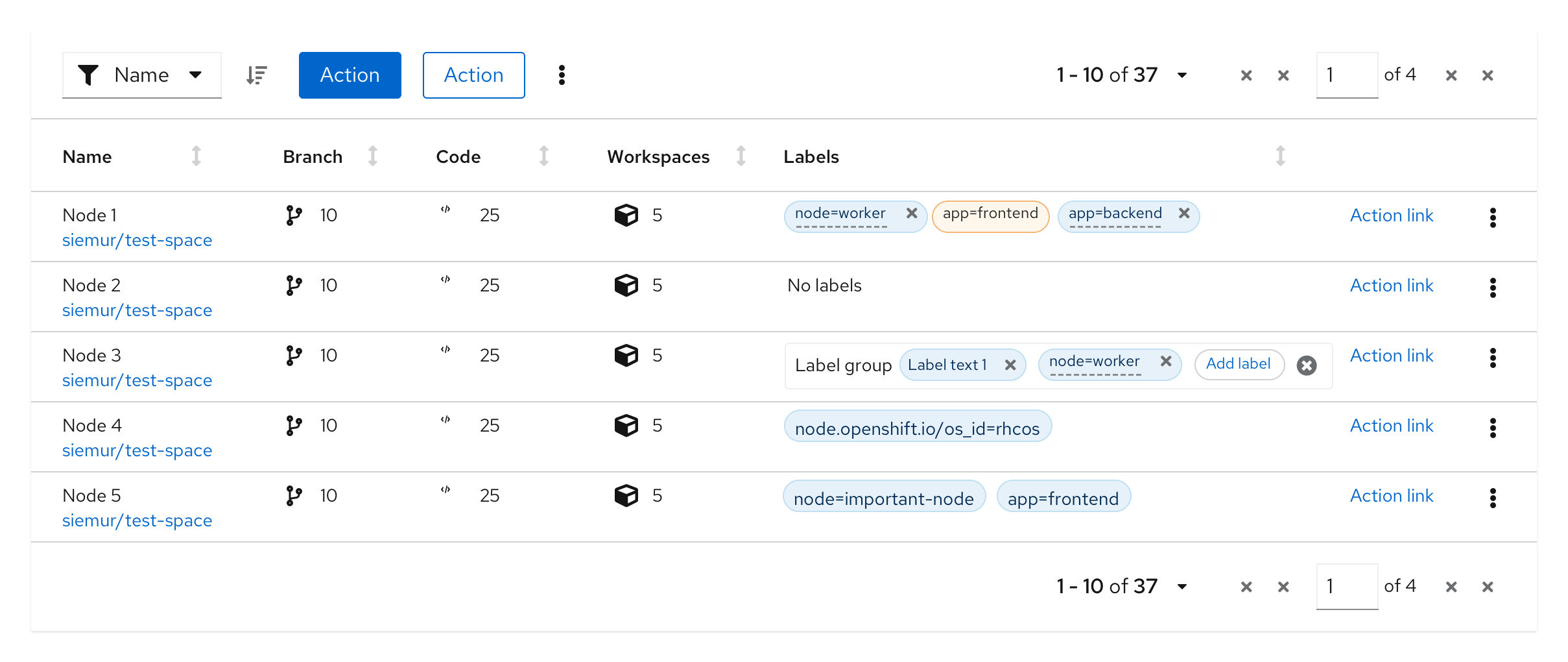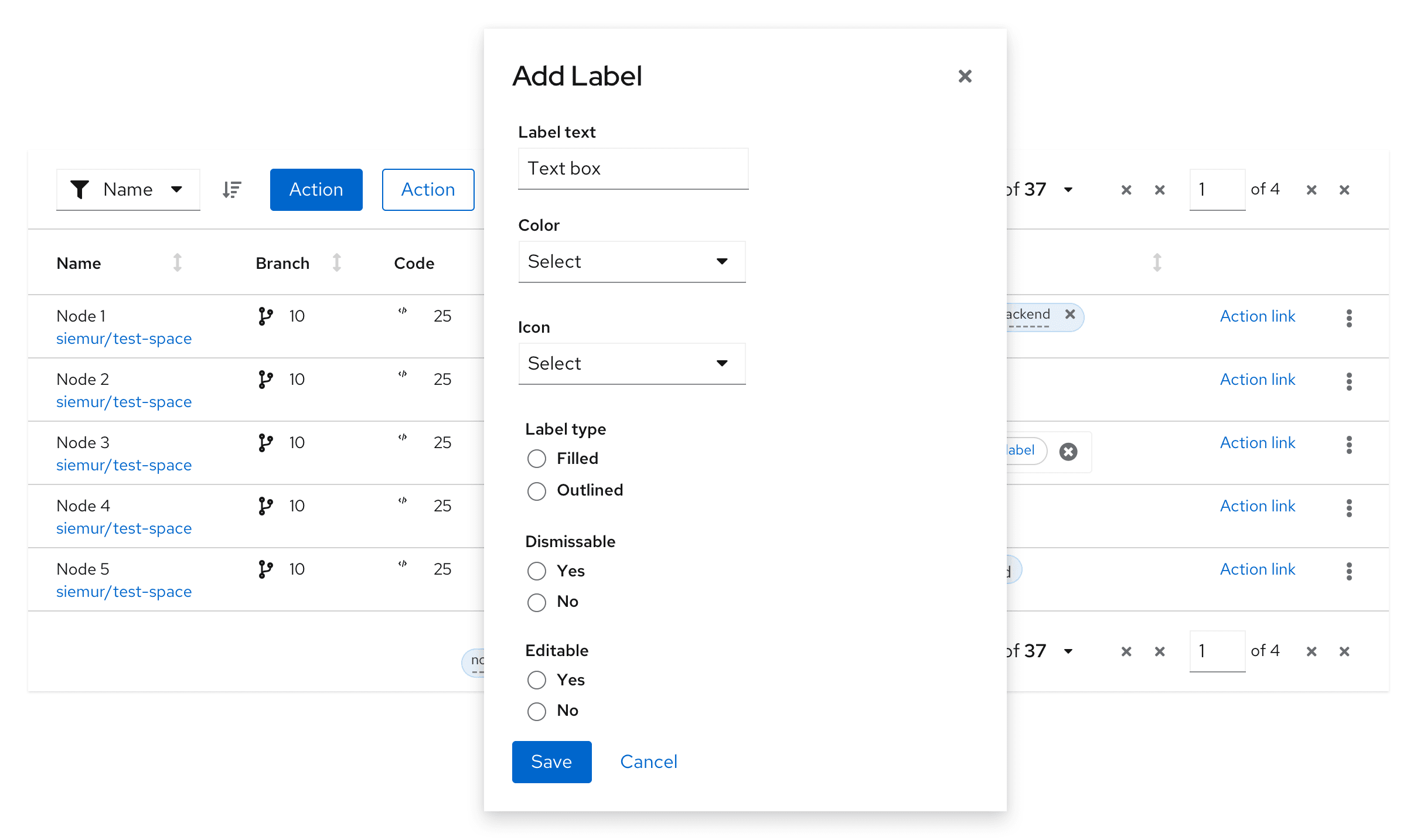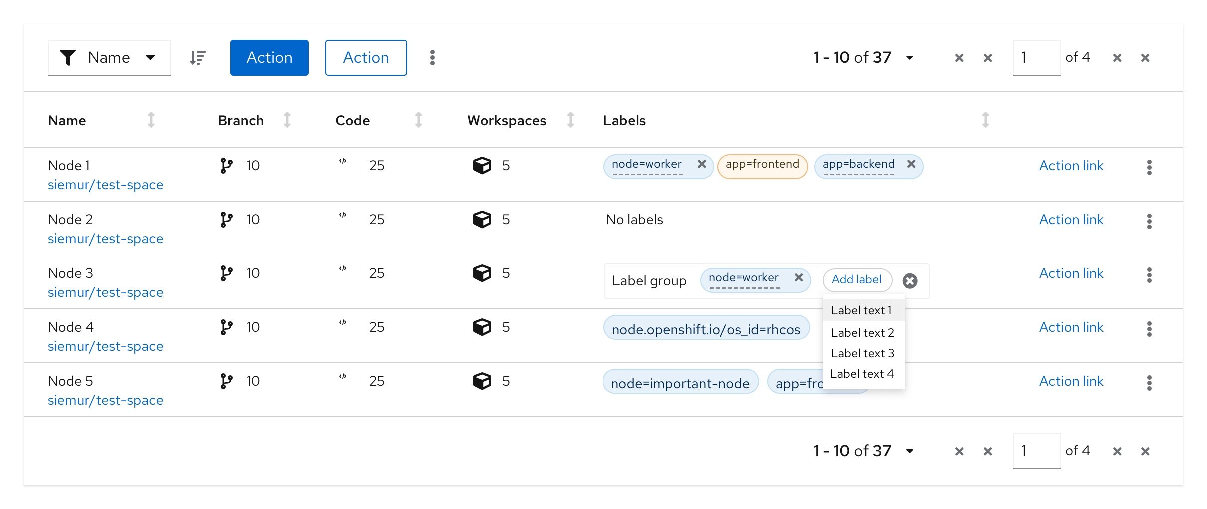 Label groups should be used when there are multiple labels assigned to a component. They can be used almost anywhere in a UI, but are commonly used in table views and description lists. Label groups can be oriented either horizontally or vertically and can optionally be named and be dismissible. You may also make the label group editable to allow users to edit an existing label or add a new label.