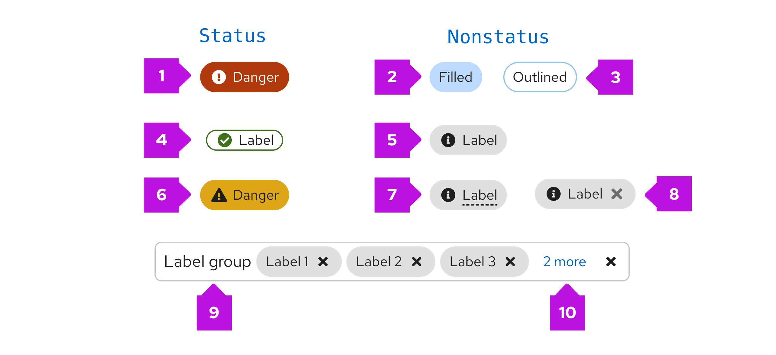 - Status label: Combines color and an icon to communicate a status, like danger, warning, or success.