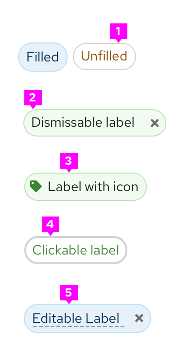 Use the filled option to add more visual prominence to a label. If your use case requires a mix of clickable and non-clickable labels, consider using 1 type for clickable and another for non-clickable. Whatever convention you choose, be sure to maintain consistency through your UI.