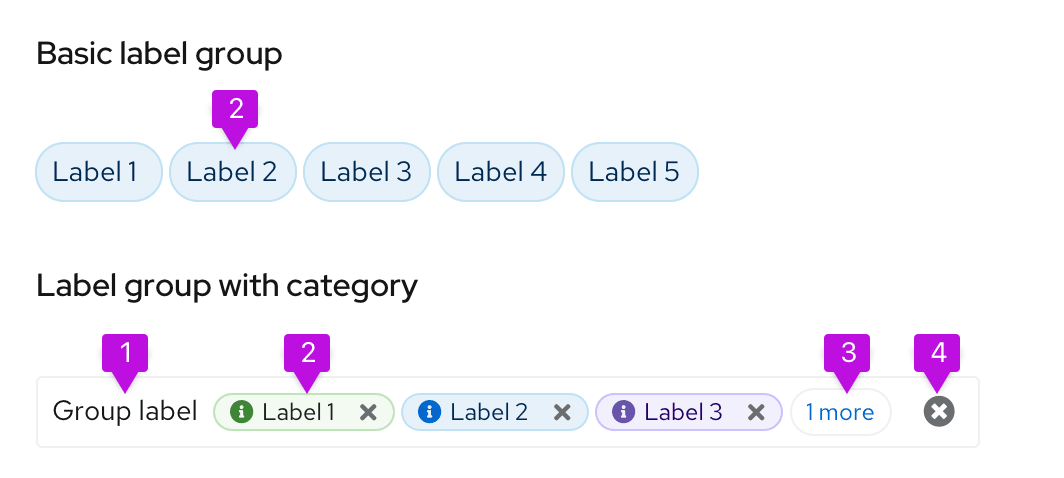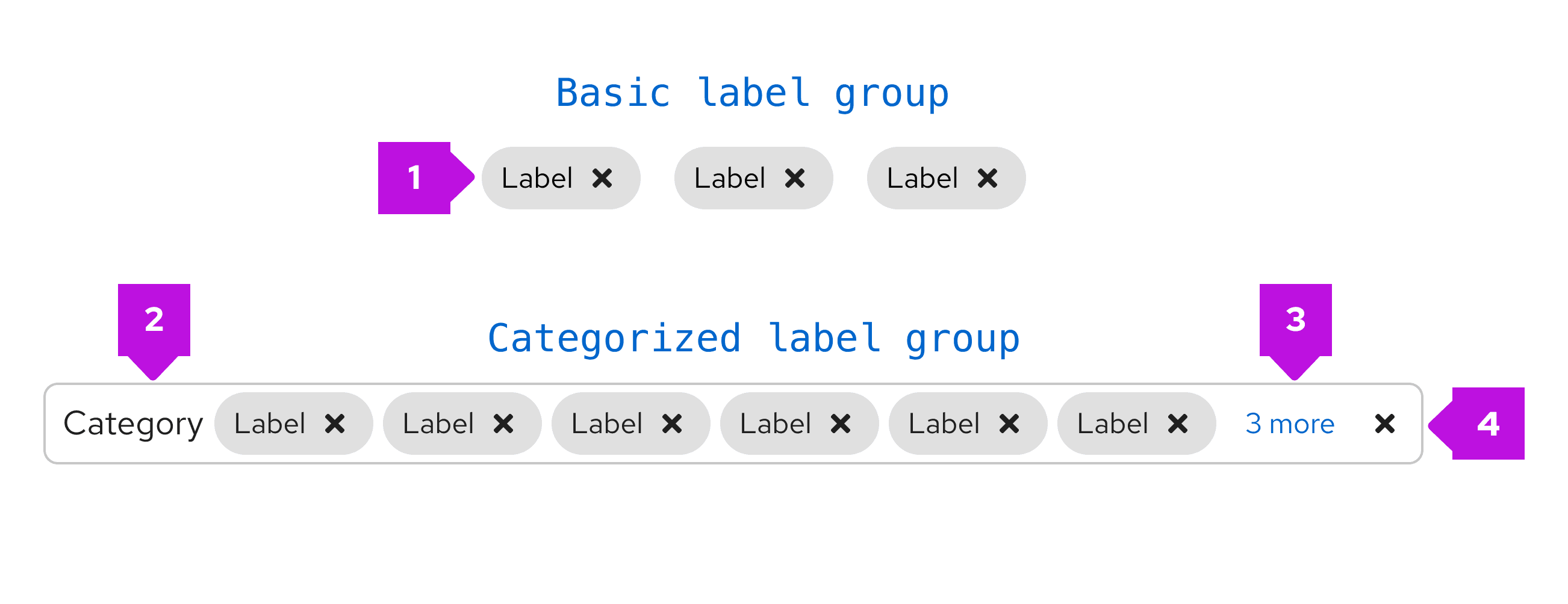 - Overflow label Contains additional labels that don't fit within the main space of the label group.