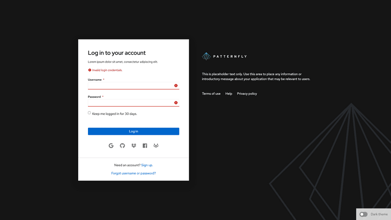 .pf-v6-c-login__main-body .pf-v6-c-form .pf-v6-c-form-helper-text | <form> | Creates the error messages shown when the form has errors. When not active, apply .pf-m-hidden. Required |