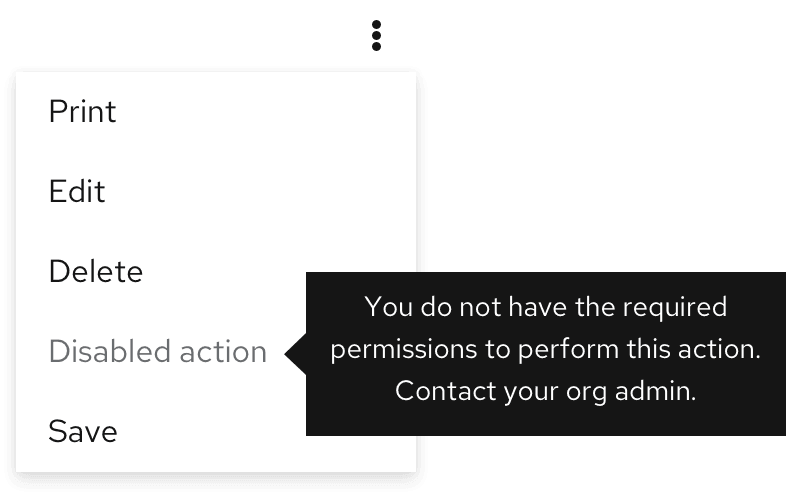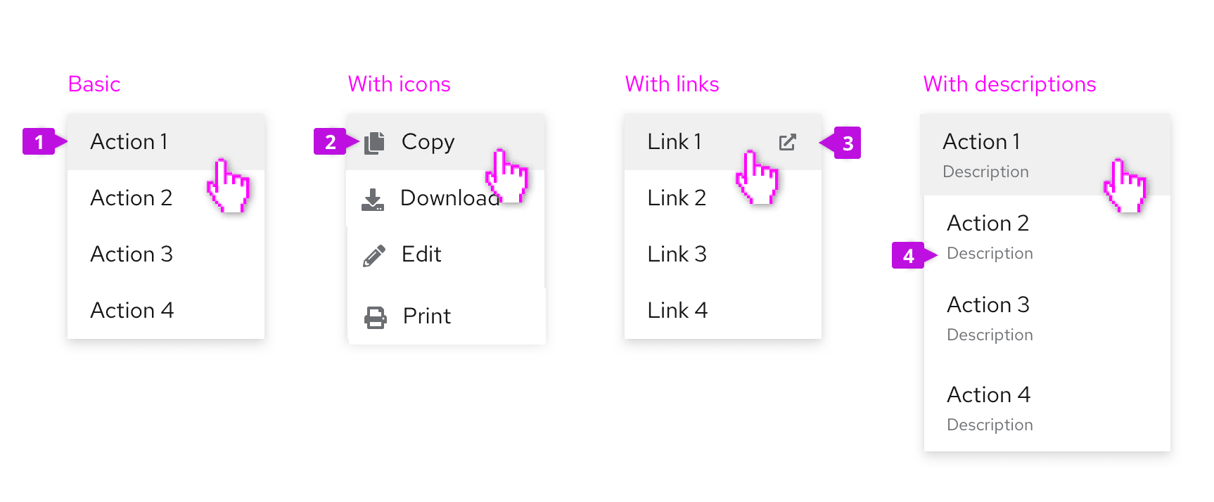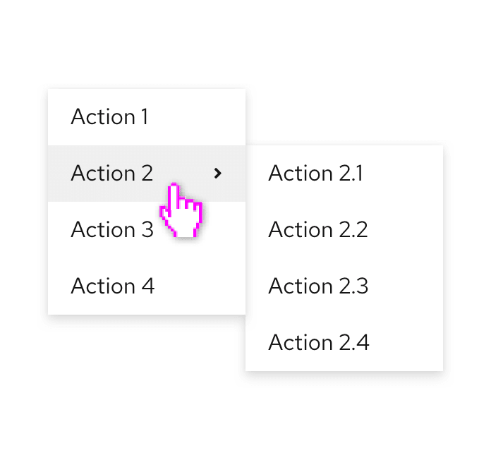 Expose a list of actions | Action menu Menu items are actions or links, with optional preceding icons to improve recognizability or an optional description to provide more context. |