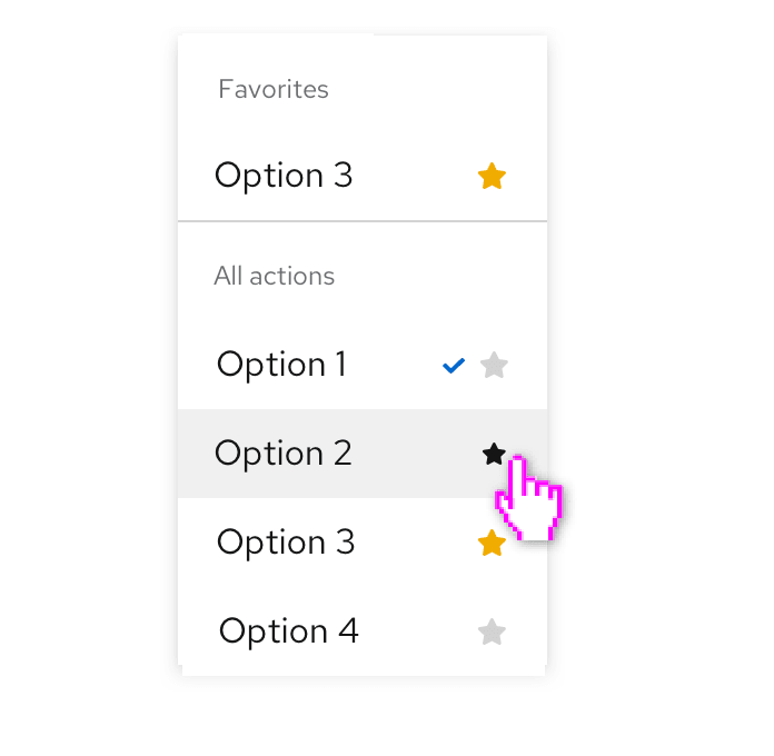 When a user favorites an item, it will be duplicated and placed at the top of the menu. This can be useful for long lists of possible actions, where users might want to “pin” a subset of items for convenience.