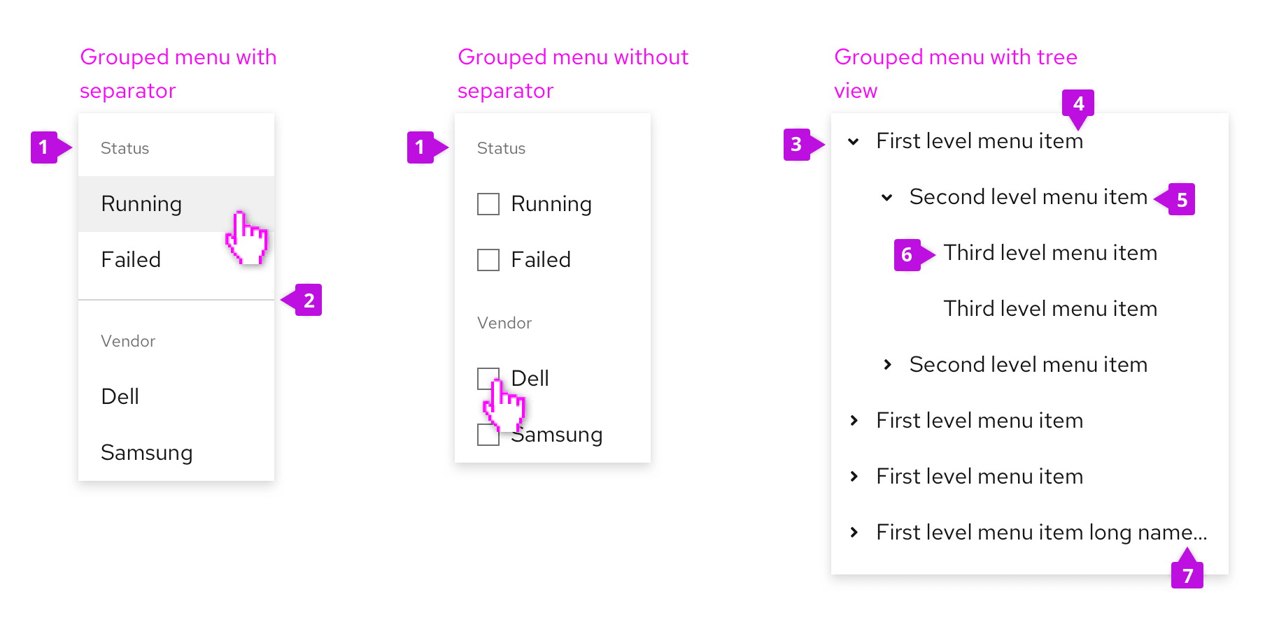 Separator (optional): Separators are horizontal dividers that help to group the menu items by clearly showing where one group ends and the next begins. You should consider whether a separator is needed to create visually distinct groups. In the first example above, a separator is used to create separation between the two groups of items. In the second example, the separator is not needed because the titled checkbox groups create 2 clearly grouped sets of options on their own.