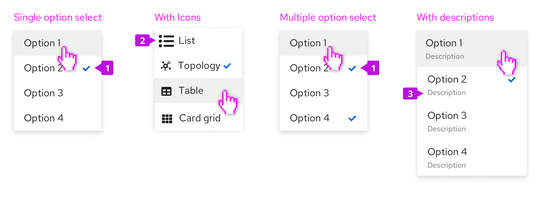 Select from a list of options | Options select menu Let users select between values rather than actions. To further improve recognition or create logical option groups, use icons, descriptions, and groupings. |