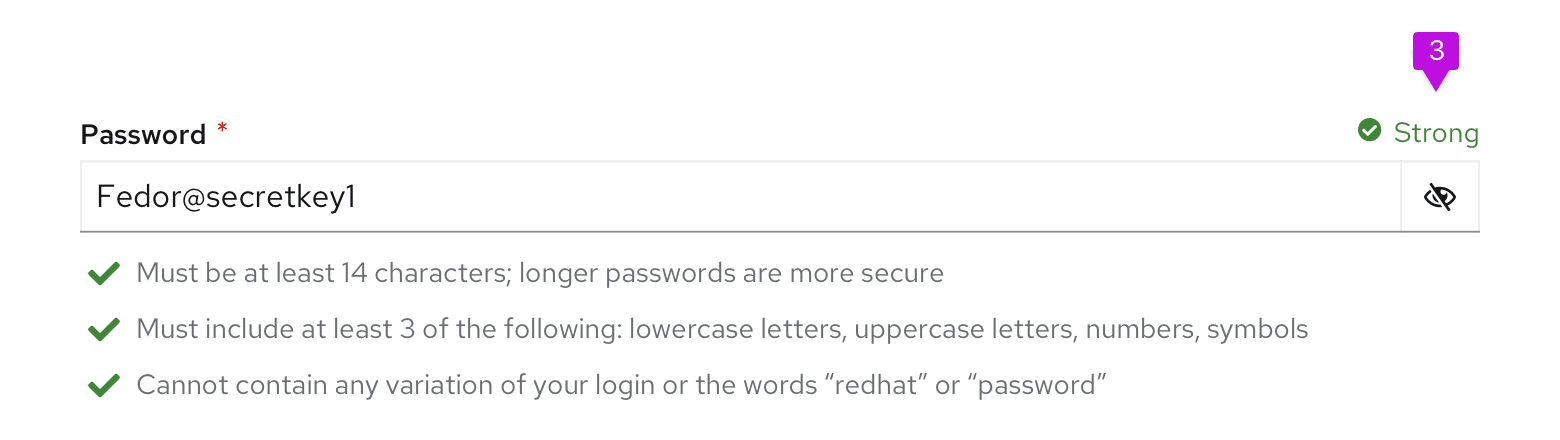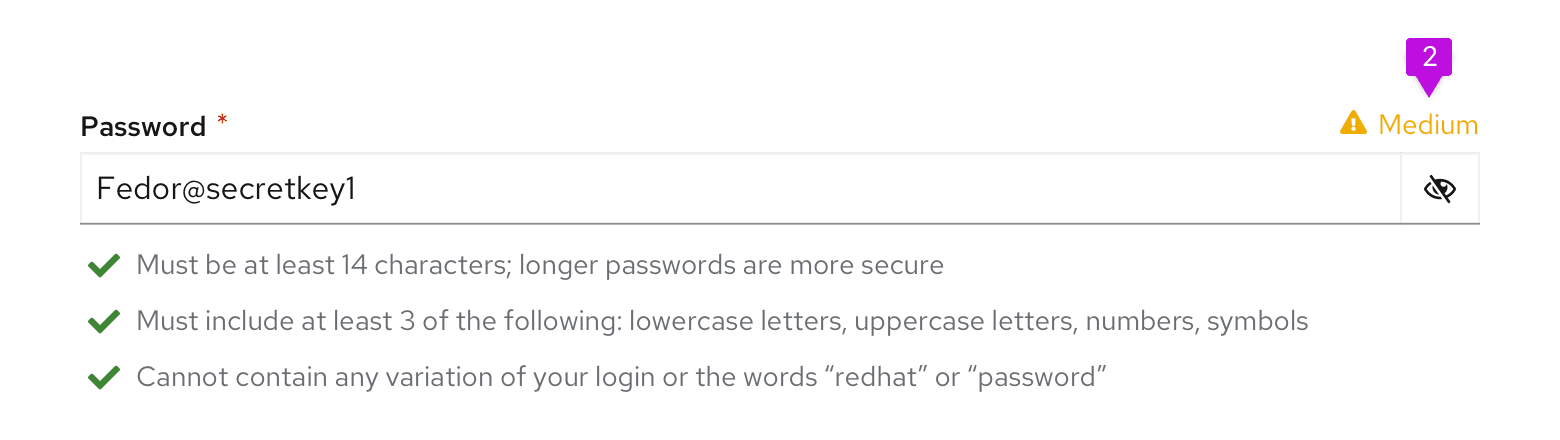 - Helper text: Displays password requirements and recommendations to improve password strength.