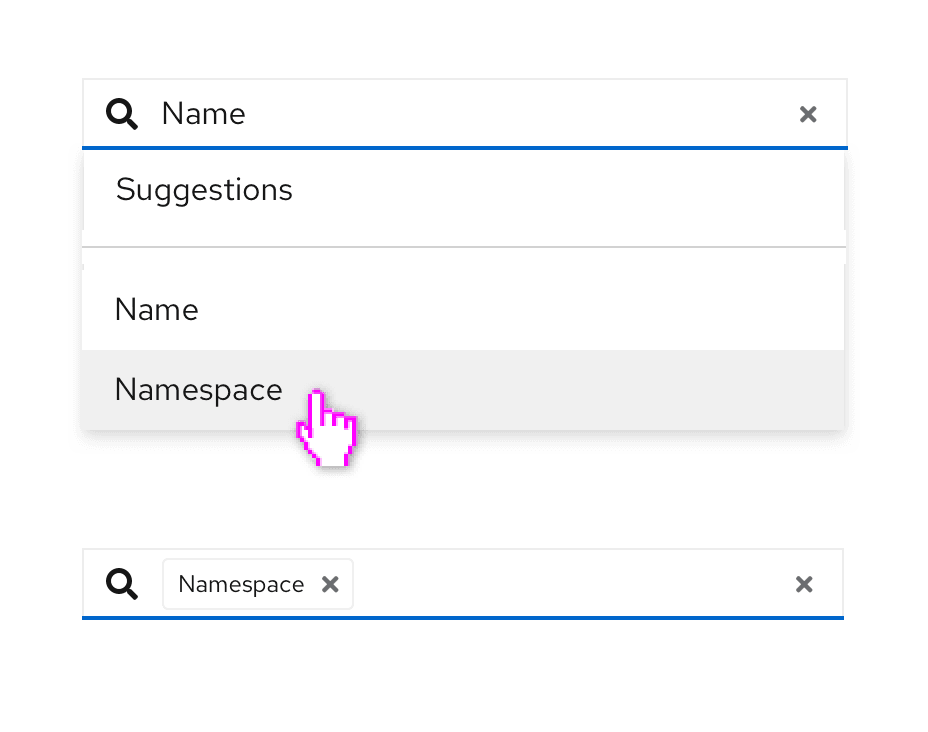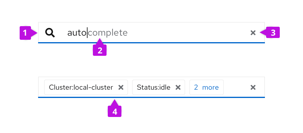 The text input group can also be used to create an auto-complete search component where suggestions are presented as a dropdown list as the user types. When only a single suggestion is available, the user can complete the entry without further typing by pressing the Tab key.