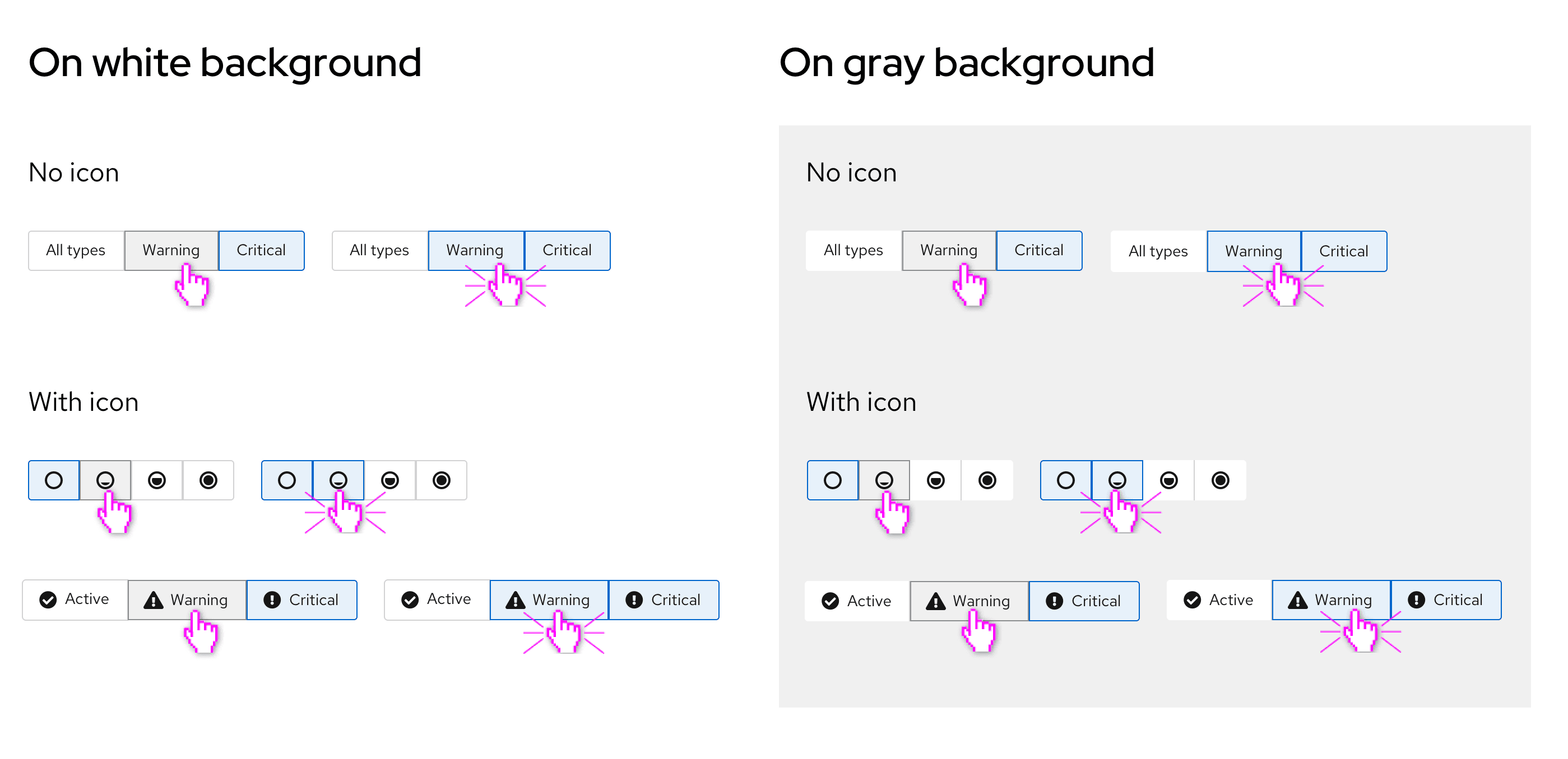 Toggle groups can be used when the user must select a single choice from a mutually exclusive set of options and can be used with or without icons. Use cases also vary depending on variation.