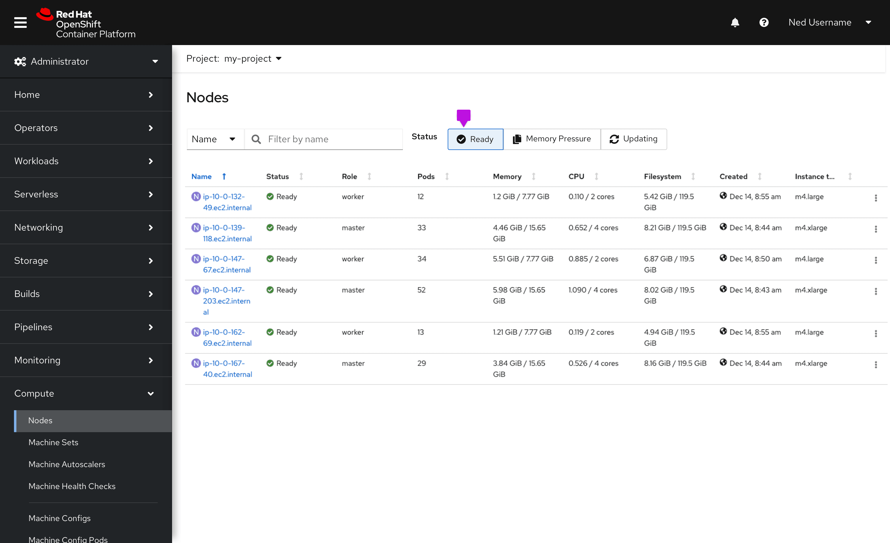 Selecting an attribute will apply that filter to the table. In this case, only nodes that are “ready” are shown.