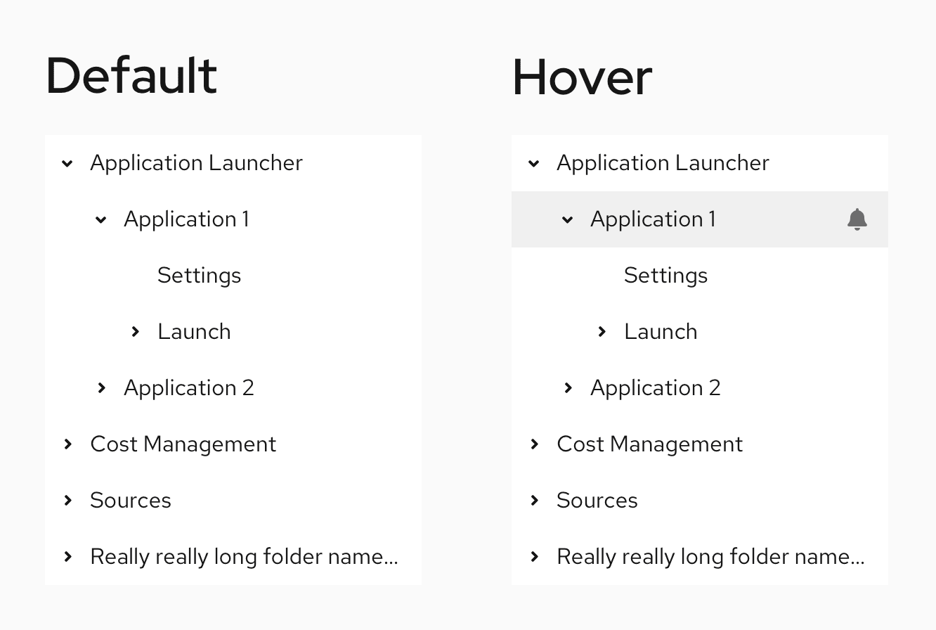 Add action items to a tree view if you’re triggering some type of action above the items. These actions appear on hover to avoid overcrowding the tree view. We recommend using 1 type of action across the whole tree and to limit the maximum of actions for 1 item to 1.