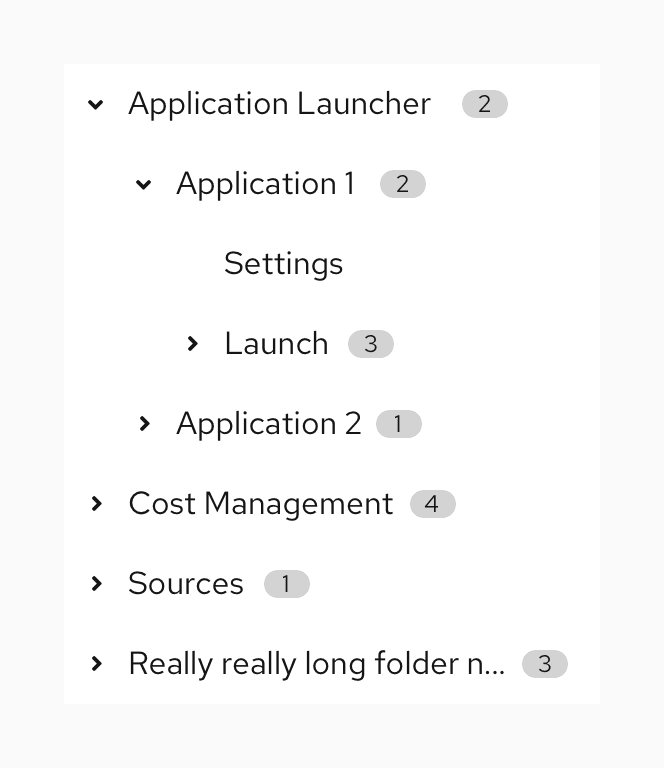 Add badges to a tree view if you want to show the number of items inside. Don’t use it for displaying different information. Items without children can't have badges, as they don't contain anything.