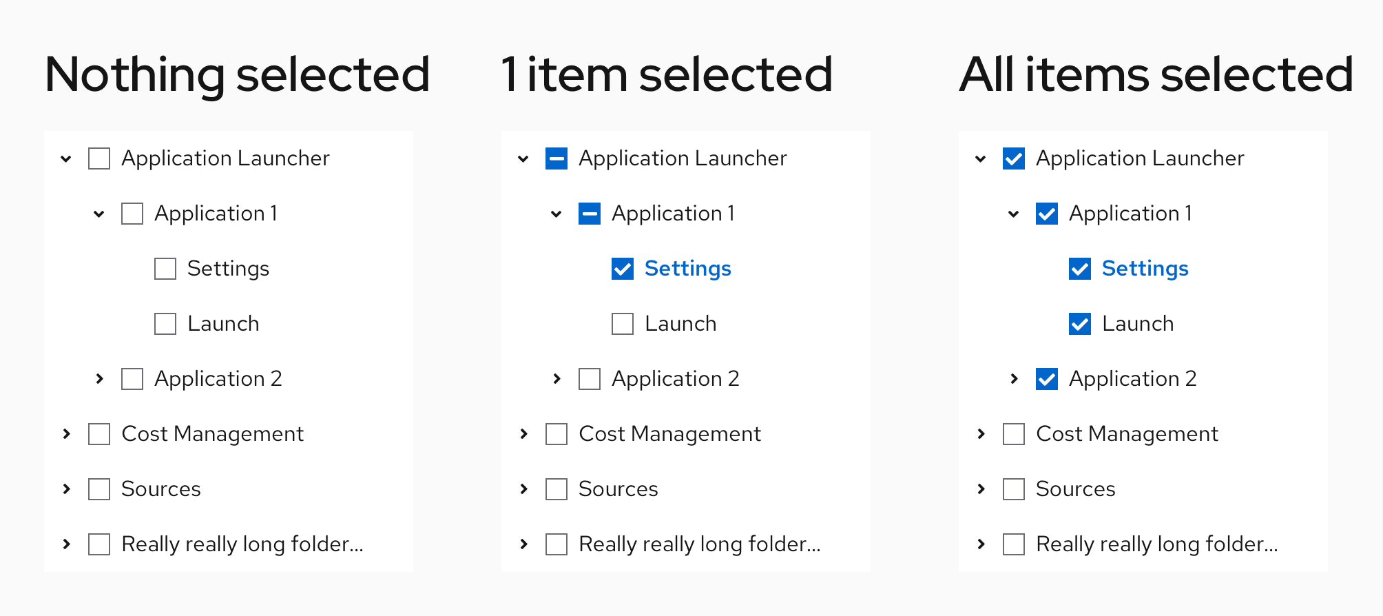 Add checkboxes to a tree view if you’re selecting multiple items or applying multiple filters. Selecting should be a primary function of your use-case. If your dataset is small and you select just 1 item, use select lists, radio buttons, checkboxes, or a dropdown instead.
