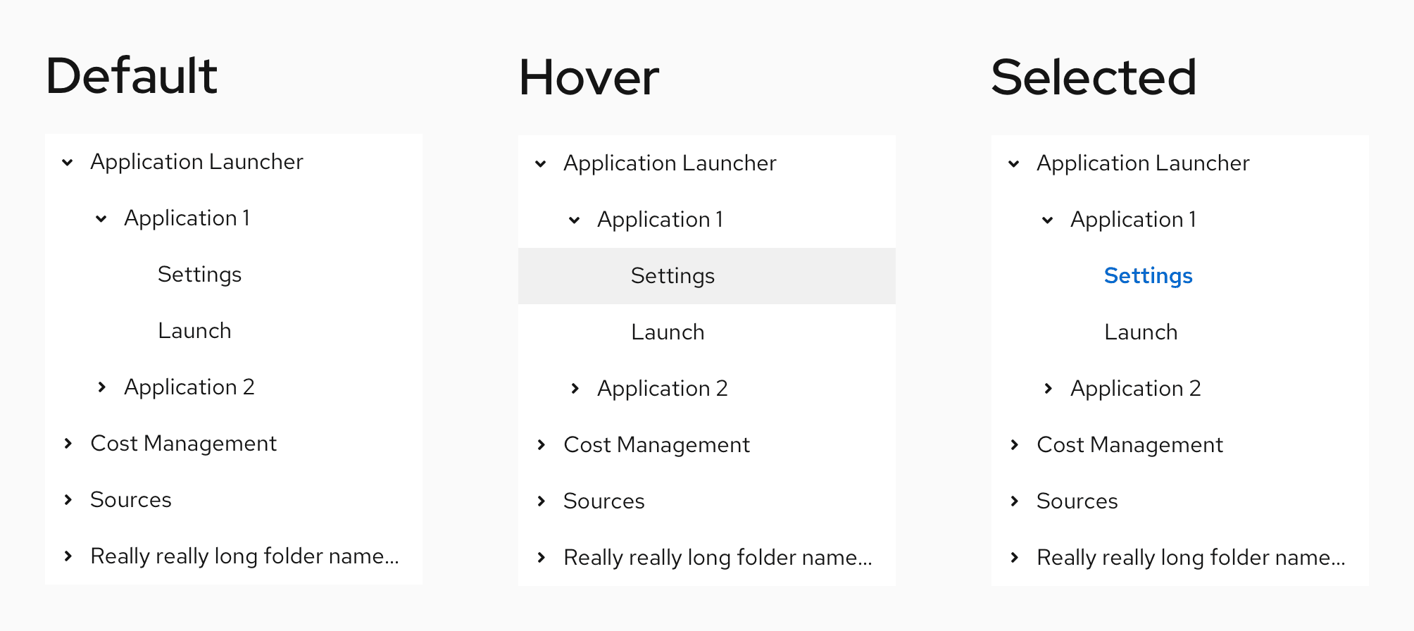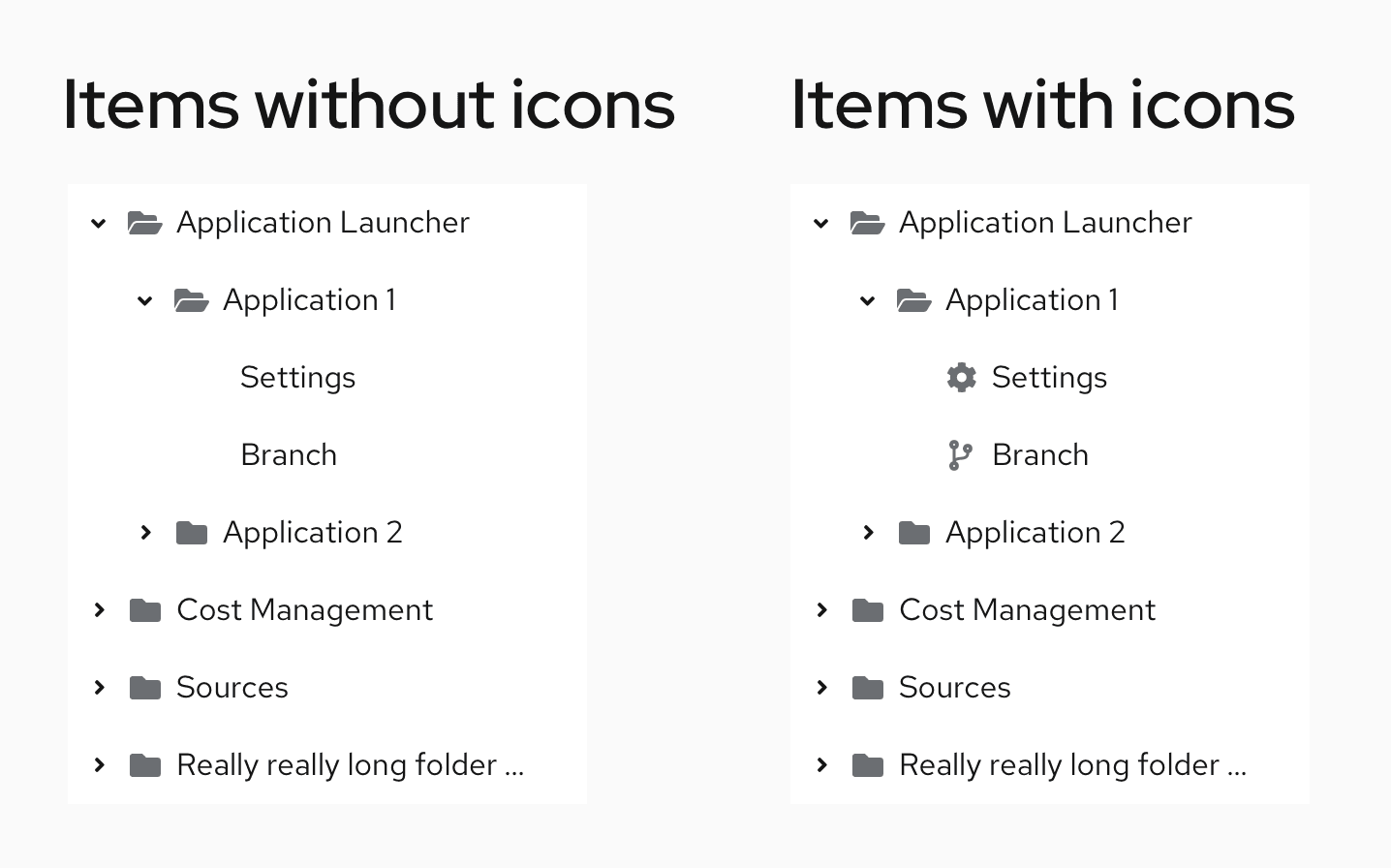 Add icons to a tree view if you want to visually represent the type of items in a tree. For example, a folder system. To maintain consistency, if you choose to add icons to a tree view, apply the icons on all items in a tree or leave the items without children iconless. We don’t recommend using icons and checkboxes at the same time due to the large indentation and loss of space it would result in.