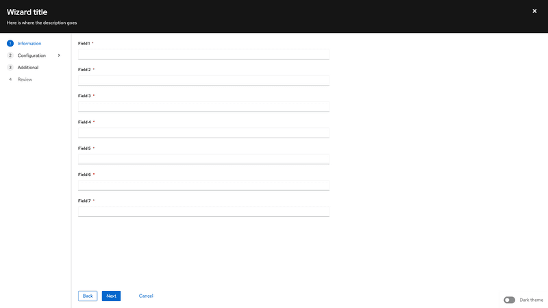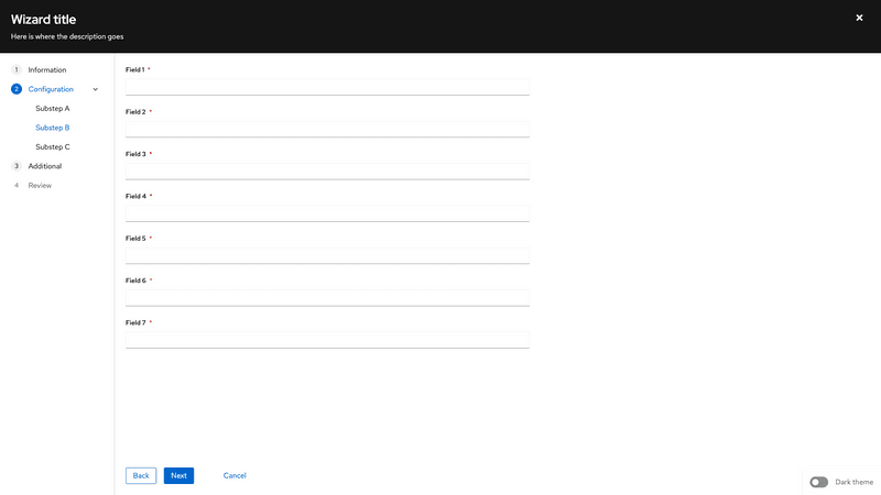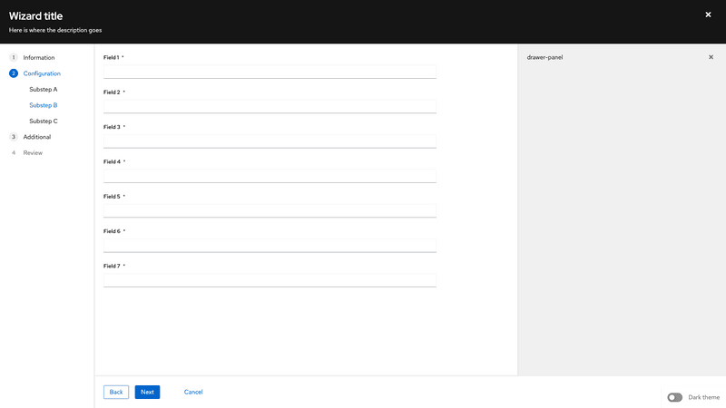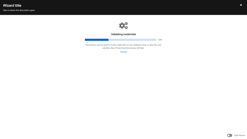 | .pf-v6-c-wizard | --pf-v6-c-wizard__description--Color | (In light theme) #4d4d4d | ||