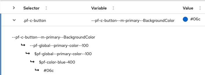 Note that all component variables are declared at the top component level (for example, .pf-v5-c-button). The component variable table linked above also shows all usages of each variable and the values they evaluate to in each case - expand any component variable row to view the global variable it is mapped to.