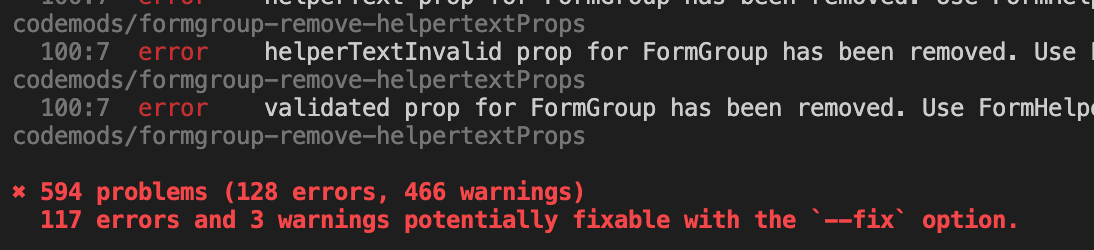 --fixflag to the end of your original command and run it again.Make note of the changes applied to your codebase.