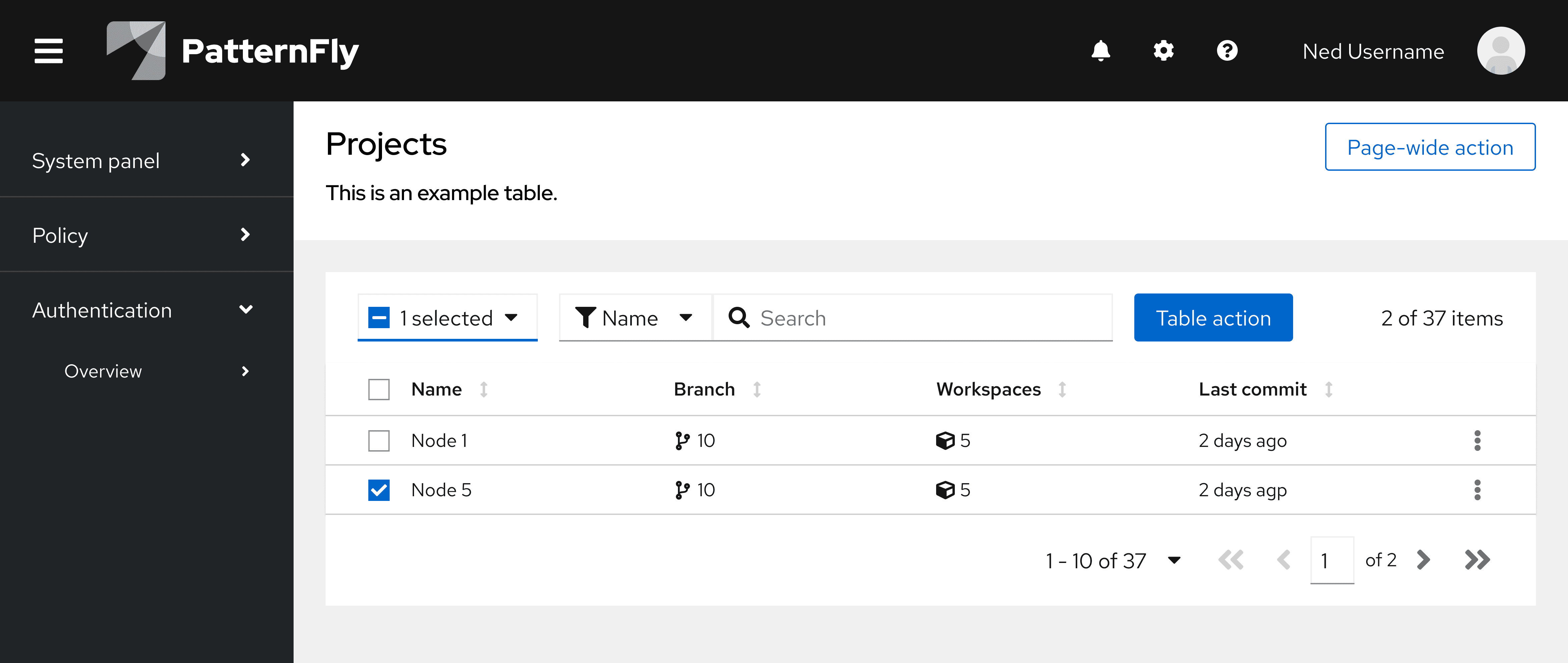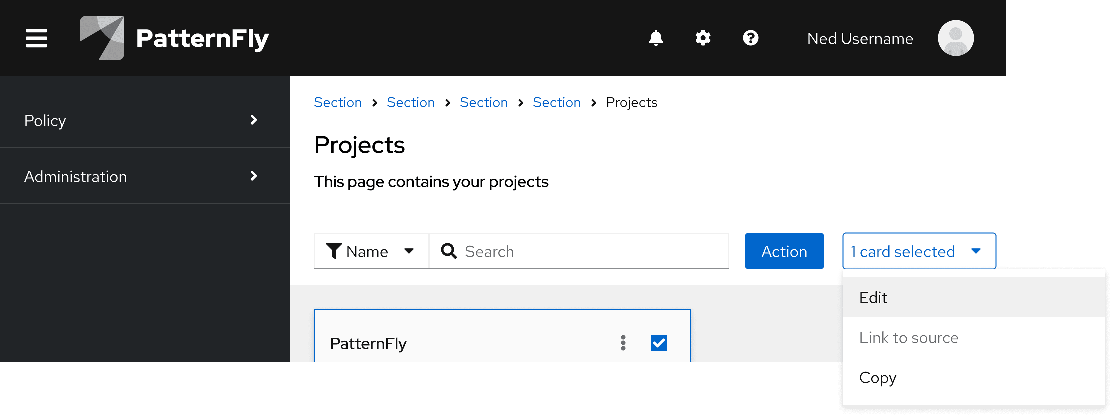 Many PatternFly components have design options that allow you to include actions. If an action affects a specific component, then the button should be placed within the component, according to its design guidelines. By placing buttons near the content that they affect, users will be able to better understand the button's use case.
