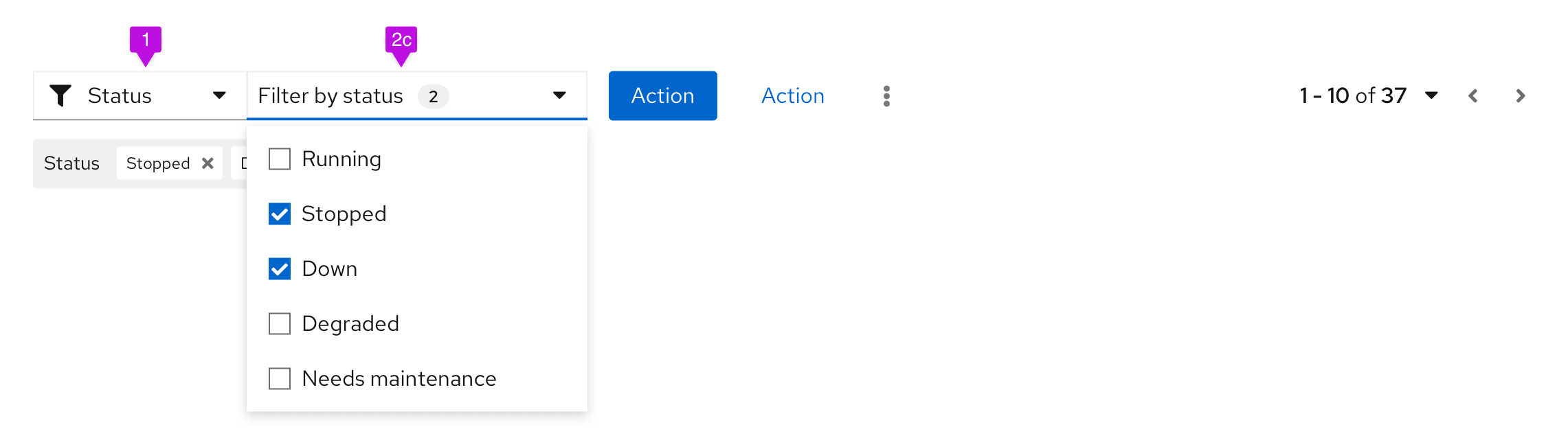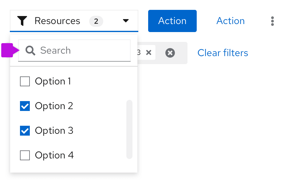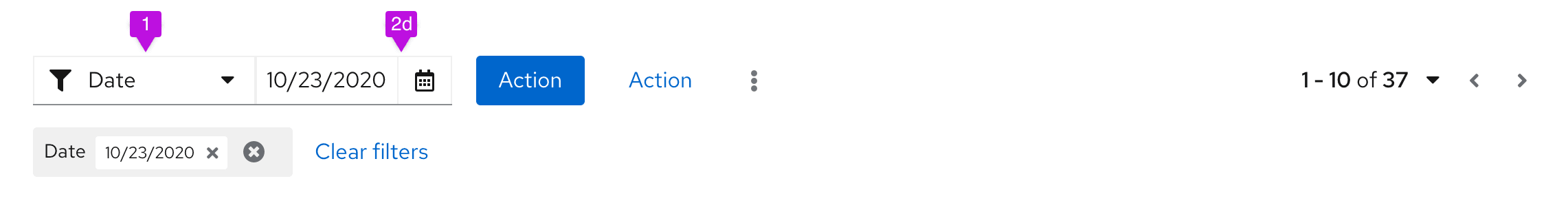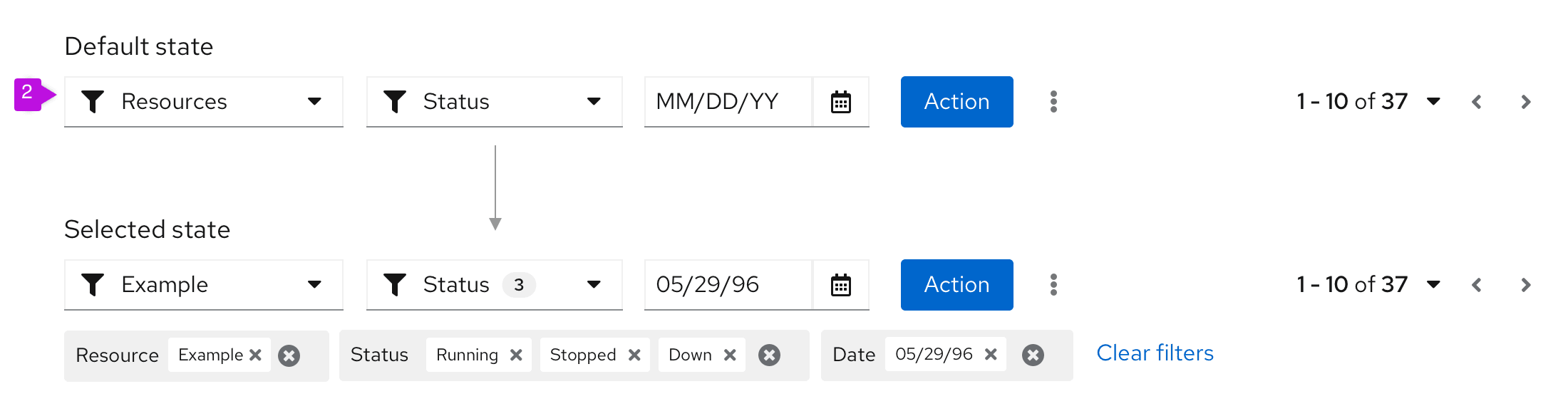 Filter queries are applied when the user selects or deselects an item in the list or selects a date/time range. If the filter group is only made up of single selects, the selected filters will be shown inside each filter’s toggle. If the filter group contains multiple selects, the selected filters will be shown as filter labels underneath the filters. Additionally, you can also choose to display the selected number of items in each filter as a badge in their toggle. A clear filter action to the right of the filters will remove all applied filters.