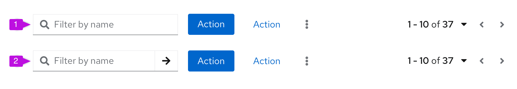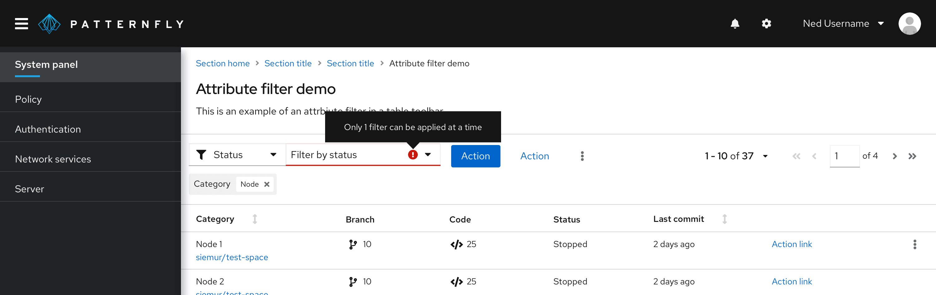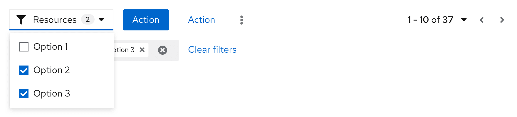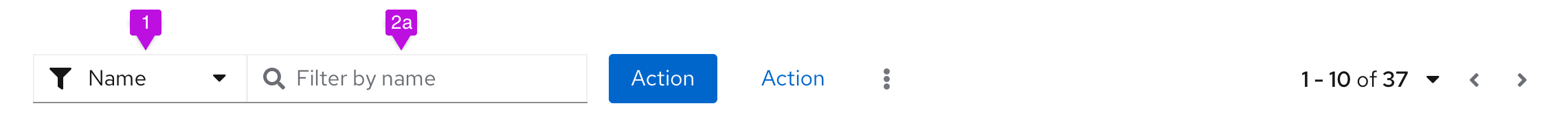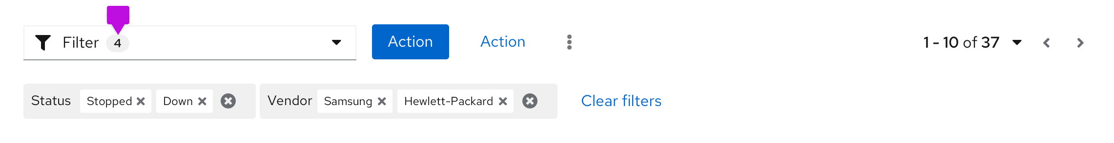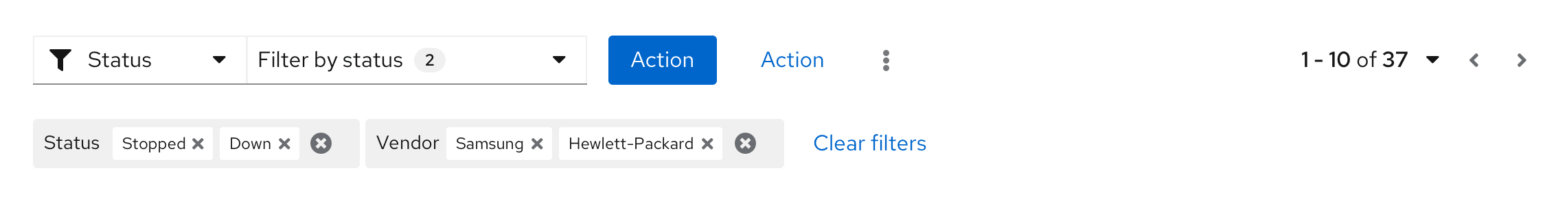 Filters can contain 1 attribute or multiple attributes. PatternFly components can be combined in different ways to create more complex filtering experiences. These different filter types can be used in a toolbar or on their own.